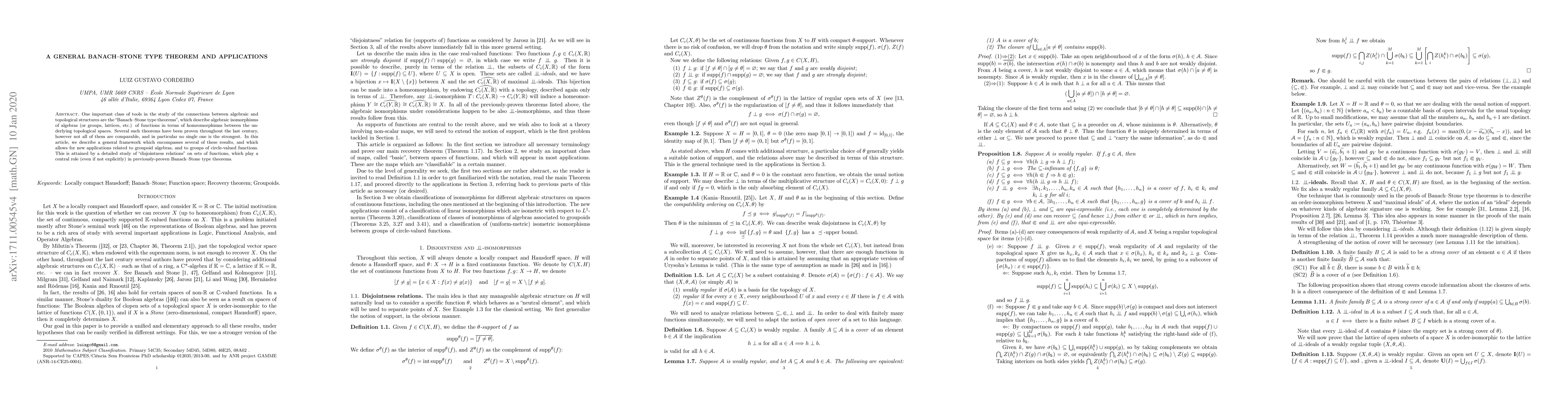 One important class of tools in the study of the connections between algebraic and topological structures are the "Banach-Stone type theorems", which describe algebraic isomorphisms of algebras (or groups, lattices, etc.) of functions in terms of homeomorphisms between the underlying topological spaces. Several such theorems have been proven throughout the last century, however not all of them are comparable, and in particular no single one is the strongest. In this article, we describe a general framework which encompasses several of these results, and which allows for new applications related to groupoid algebras, and to groups of circle-valued functions. This is attained by a detailed study of "disjointness relations" on sets of functions, which play a central role (even if not explicitly) in previously-proven Banach-Stone type theorems.