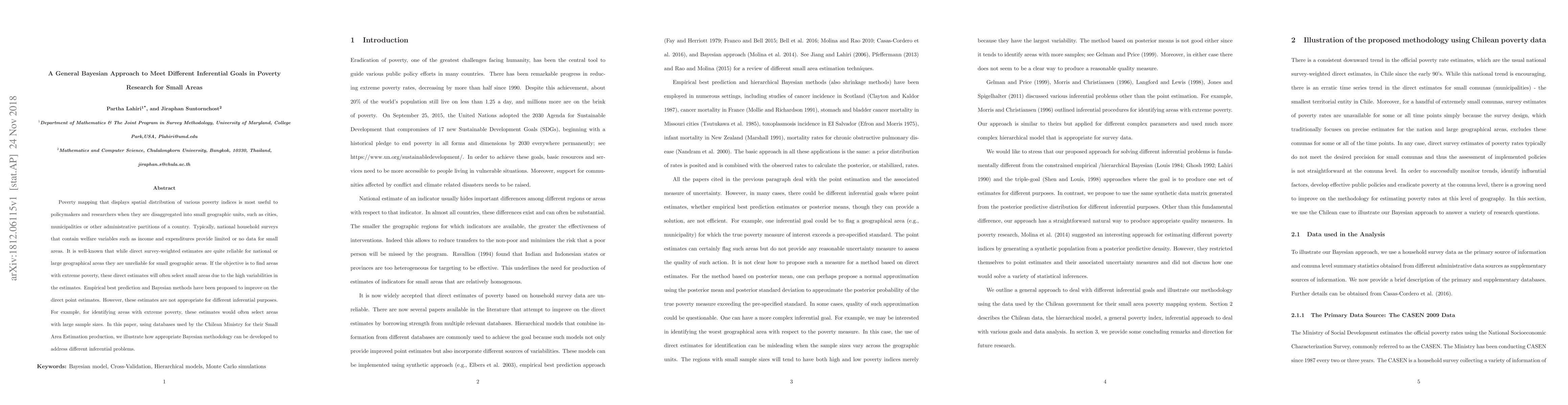 This paper proposes a general Bayesian approach for poverty mapping in small geographic areas, addressing the limitations of direct survey-weighted estimates. It demonstrates how Bayesian methods can be tailored to different inferential goals, such as identifying areas with extreme poverty, using data from the Chilean Ministry for small area estimation.