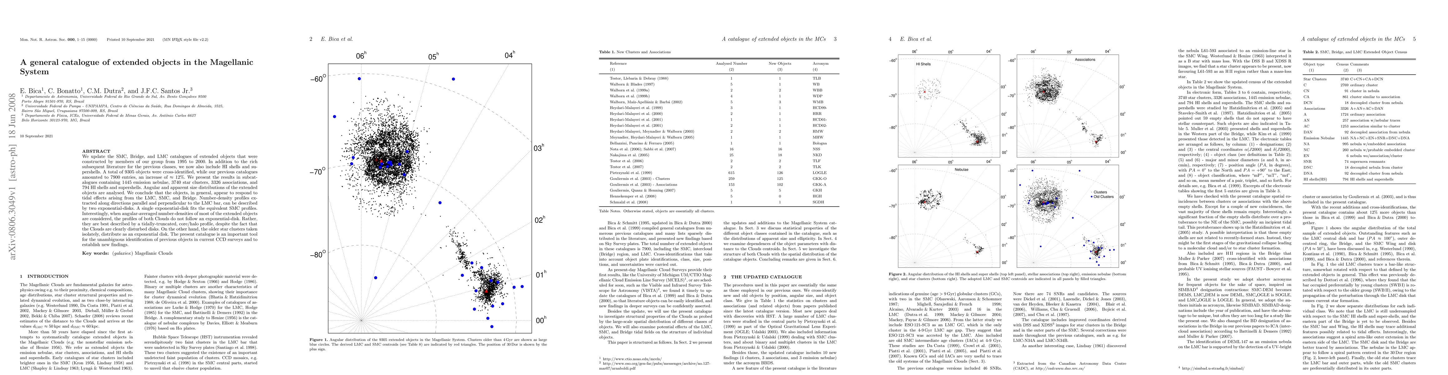 We update the SMC, Bridge, and LMC catalogues of extended objects that were constructed by members of our group from 1995 to 2000. In addition to the rich subsequent literature for the previous classes, we now also include HI shells and supershells. A total of 9305 objects were cross-identified, while our previous catalogues amounted to 7900 entries, an increase of $\approx12%$. We present the results in subcatalogues containing 1445 emission nebulae, 3740 star clusters, 3326 associations, and 794 HI shells and supershells. Angular and apparent size distributions of the extended objects are analysed. We conclude that the objects, in general, appear to respond to tidal effects arising from the LMC, SMC, and Bridge. Number-density profiles extracted along directions parallel and perpendicular to the LMC bar, can be described by two exponential-disks. A single exponential-disk fits the equivalent SMC profiles. Interestingly, when angular-averaged number-densities of most of the extended objects are considered, the profiles of both Clouds do not follow an exponential-disk. Rather, they are best described by a tidally-truncated, core/halo profile, despite the fact that the Clouds are clearly disturbed disks. On the other hand, the older star clusters taken isolately, distribute as an exponential disk. The present catalogue is an important tool for the unambiguous identification of previous objects in current CCD surveys and to establish new findings.