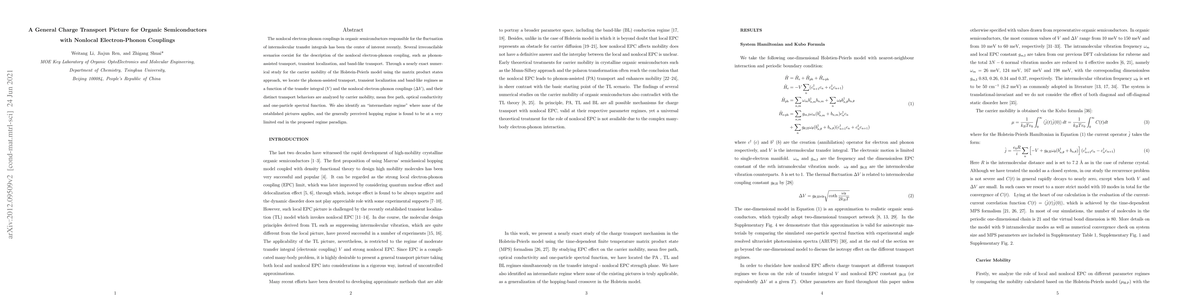 This paper investigates the nonlocal electron-phonon couplings in organic semiconductors, identifying distinct transport regimes—phonon-assisted, transient localization, and band-like—through a numerical study of the Holstein-Peierls model. An "intermediate regime" is also discovered where established transport models do not apply.