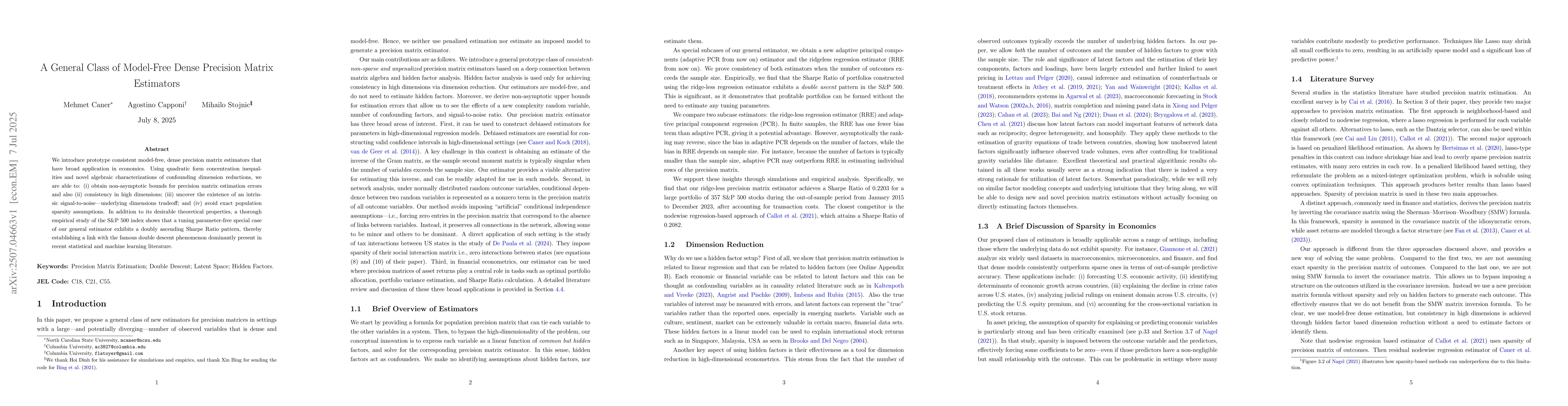 We introduce prototype consistent model-free, dense precision matrix estimators that have broad application in economics. Using quadratic form concentration inequalities and novel algebraic characterizations of confounding dimension reductions, we are able to: (i) obtain non-asymptotic bounds for precision matrix estimation errors and also (ii) consistency in high dimensions; (iii) uncover the existence of an intrinsic signal-to-noise -- underlying dimensions tradeoff; and (iv) avoid exact population sparsity assumptions. In addition to its desirable theoretical properties, a thorough empirical study of the S&P 500 index shows that a tuning parameter-free special case of our general estimator exhibits a doubly ascending Sharpe Ratio pattern, thereby establishing a link with the famous double descent phenomenon dominantly present in recent statistical and machine learning literature.