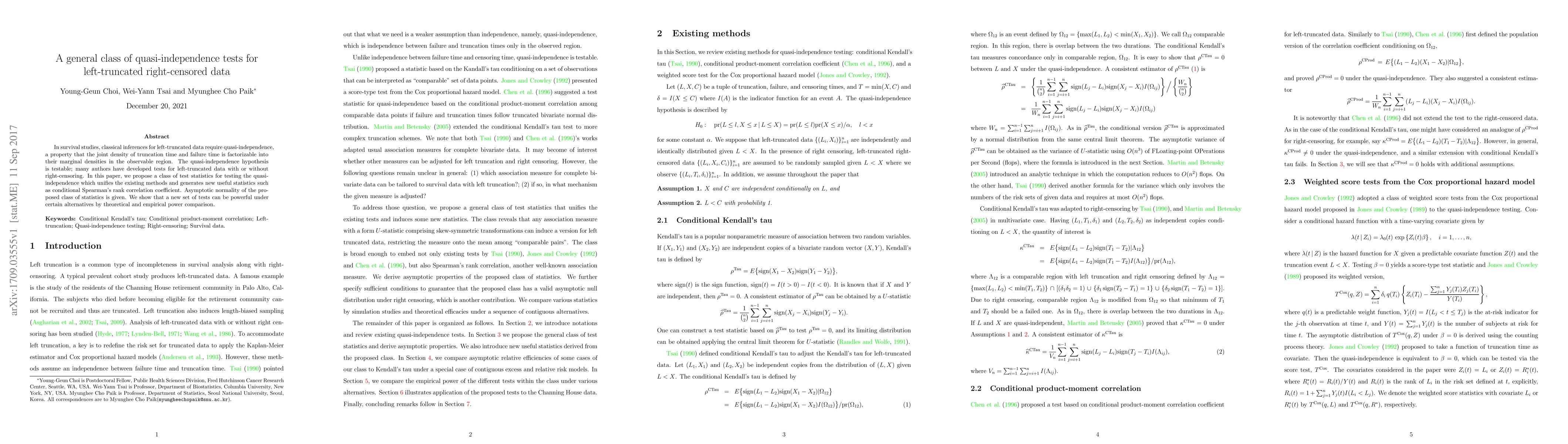 This paper proposes a unified class of quasi-independence test statistics for survival data that is left-truncated and right-censored, introducing new metrics like the conditional Spearman's rank correlation coefficient. The proposed tests demonstrate asymptotic normality and superior empirical power compared to existing methods.