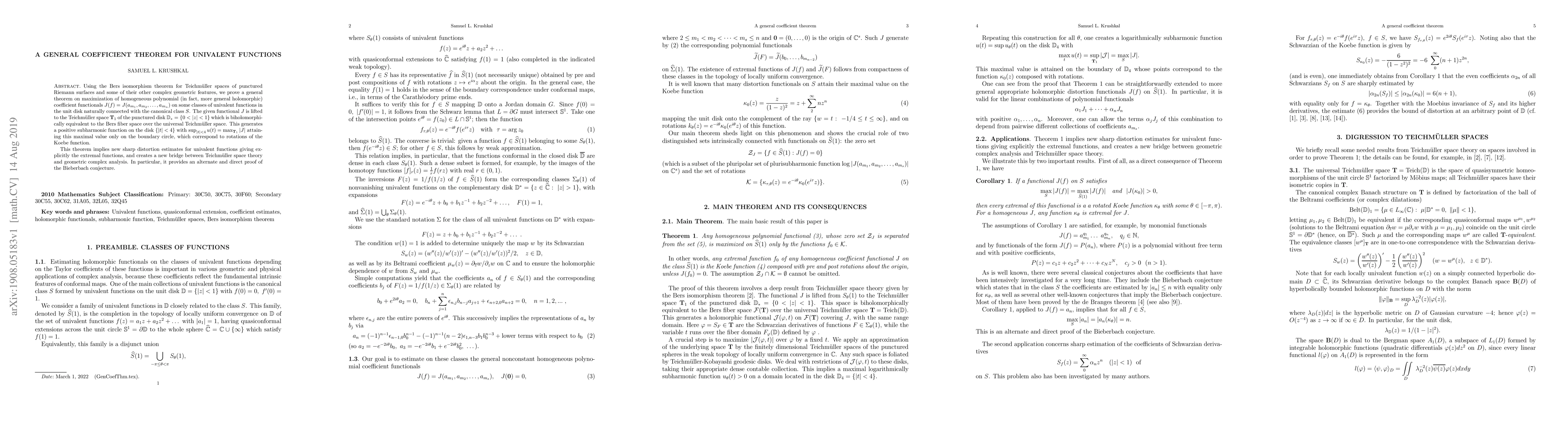Using the Bers isomorphism theorem for Teichmuller spaces of punctured Riemann surfaces and some of their other complex geometric features, we prove a general theorem on maximization of homogeneous polynomial (in fact, more general holomorphic) coefficient functionals $J(f) = J(a_{m_1}, a_{m_2},\dots, a_{m_n}) $ on some classes of univalent functions in the unit disk naturally connected with the canonical class $S$. The given functional $J$ is lifted to the Teichmuller space $\mathbf T_1$ of the punctured disk $\mathbb{D}_{*} = \{0 < |z| < 1\}$ which is biholomorphically equivalent to the Bers fiber space over the universal Teichmuller space. This generates a positive subharmonic function on the disk $\{|t| < 4\}$ with $\sup_{|t|<4} u(t) = \max_{\mathbf T_1} |J|$ attaining this maximal value only on the boundary circle, which correspond to rotations of the Koebe function. This theorem implies new sharp distortion estimates for univalent functions giving explicitly the extremal functions, and creates a new bridge between Teichm\"{u}ller space theory and geometric complex analysis. In particular, it provides an alternate and direct proof of the Bieberbach conjecture.