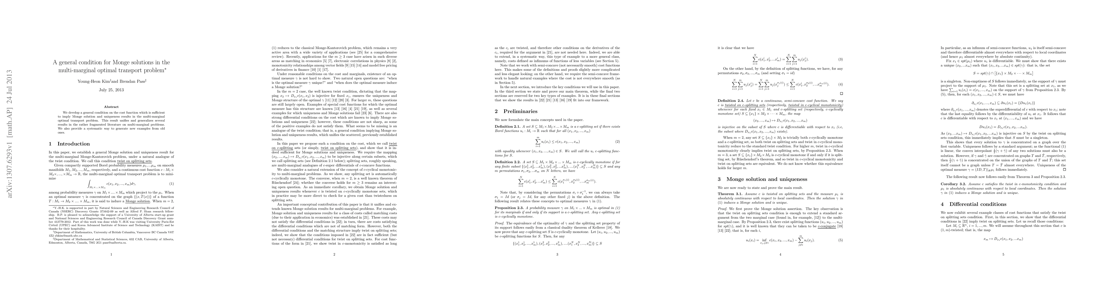 This research establishes a general condition for cost functions ensuring Monge solutions and uniqueness in multi-marginal optimal transport problems, unifying existing fragmented results and offering a method to generate new examples.