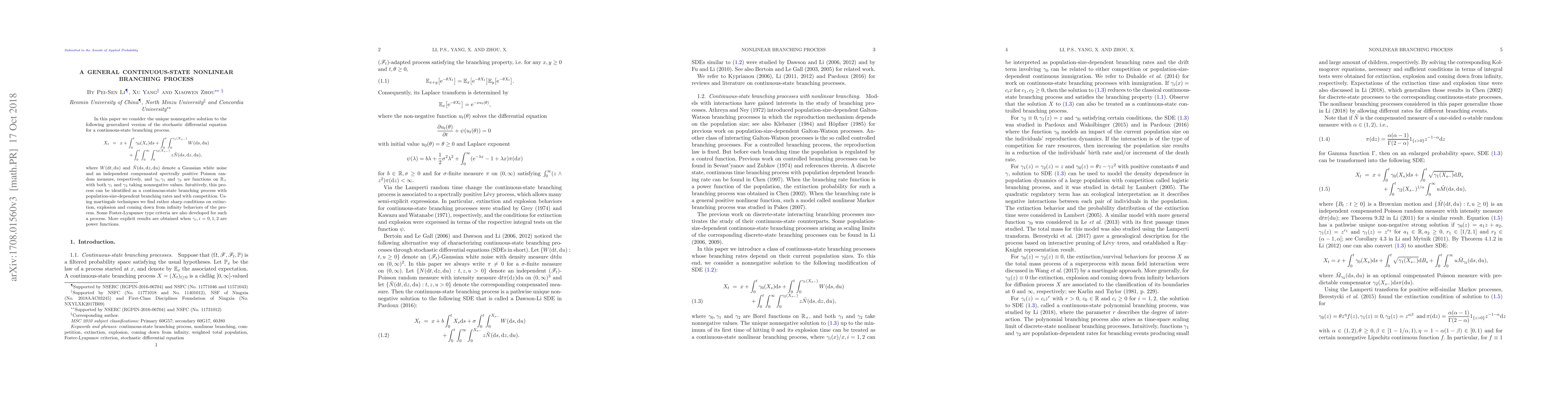 In this paper we consider the unique nonnegative solution to the following generalized version of the stochastic differential equation for a continuous-state branching process. \beqnn X_t \ar=\ar x+\int_0^t\gamma_0(X_s)\dd s+\int_0^t\int_0^{\gamma_1(X_{s-})} W(\dd s,\dd u)\cr \ar\ar\qquad+\int_0^t\int_{0}^\infty\int_0^{\gamma_2(X_{s-})} z\tilde{N}(\dd s, \dd z, \dd u), \eeqnn where $W(\dd t,\dd u) $ and $\tilde{N}(\dd s, \dd z, \dd u)$ denote a Gaussian white noise and an independent compensated spectrally positive Poisson random measure, respectively, and $\gamma_0,\gamma_1$ and $\gamma_2$ are functions on $\mbb{R}_+$ with both $\gamma_1$ and $\gamma_2$ taking nonnegative values. Intuitively, this process can be identified as a continuous-state branching process with population-size-dependent branching rates and with competition. Using martingale techniques we find rather sharp conditions on extinction, explosion and coming down from infinity behaviors of the process. Some Foster-Lyapunov type criteria are also developed for such a process. More explicit results are obtained when $\gamma_i, i=0, 1, 2$ are power functions.
