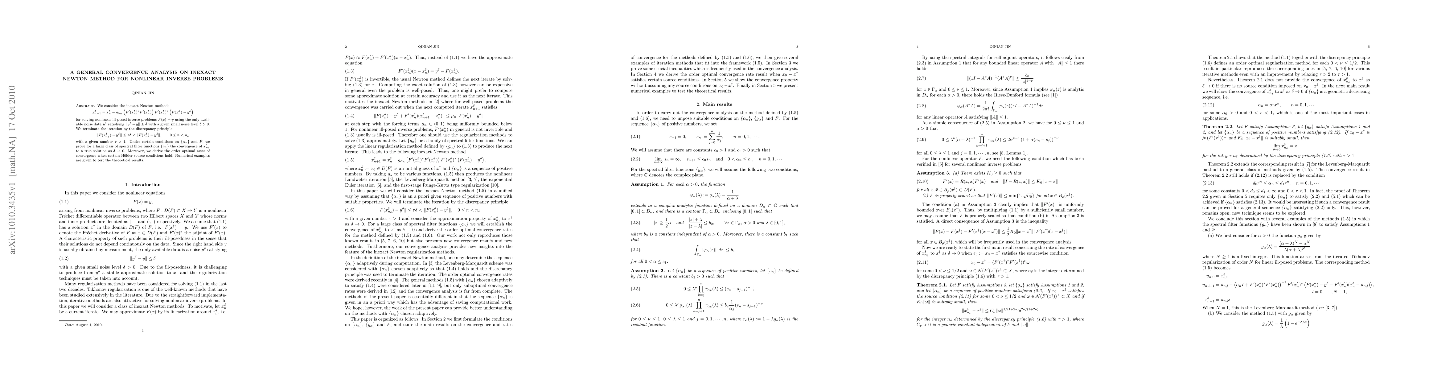 This paper analyzes the convergence of inexact Newton methods for solving nonlinear inverse problems with noisy data, proving convergence under certain conditions and deriving optimal rates of convergence.