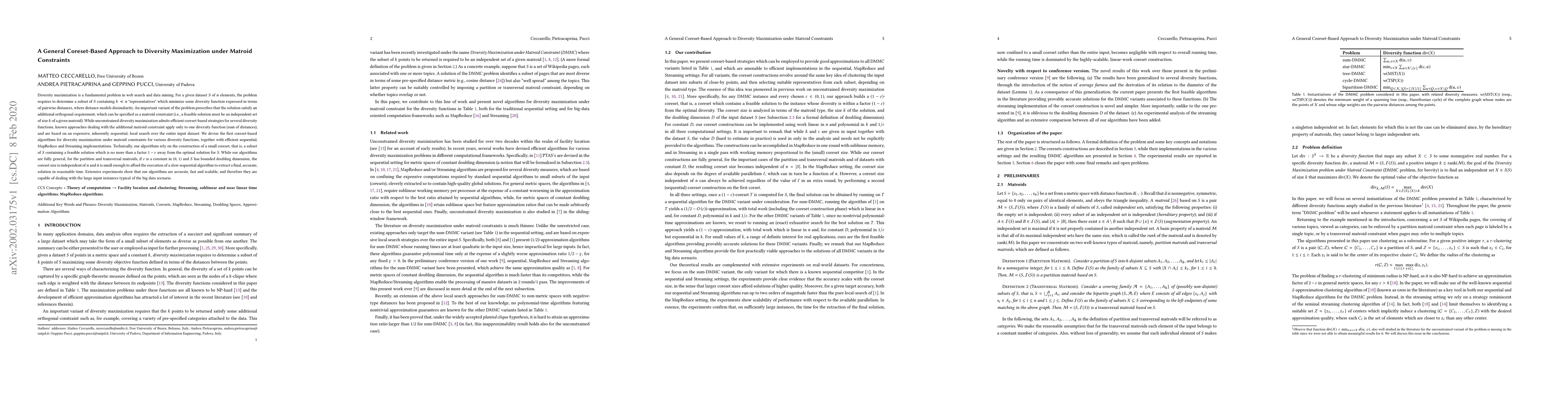 This paper presents the first coreset-based algorithms for optimizing diversity under matroid constraints for various diversity functions, offering efficient sequential, MapReduce, and Streaming implementations. The proposed algorithms construct a small coreset to achieve near-optimal solutions, demonstrating accuracy, speed, and scalability suitable for large datasets typical of big data scenarios.