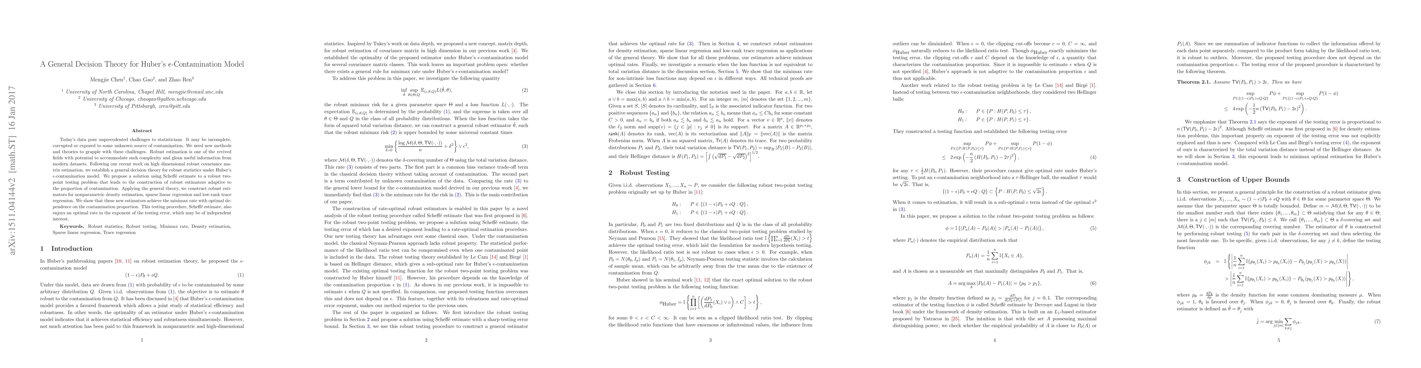 Today's data pose unprecedented challenges to statisticians. It may be incomplete, corrupted or exposed to some unknown source of contamination. We need new methods and theories to grapple with these challenges. Robust estimation is one of the revived fields with potential to accommodate such complexity and glean useful information from modern datasets. Following our recent work on high dimensional robust covariance matrix estimation, we establish a general decision theory for robust statistics under Huber's $\epsilon$-contamination model. We propose a solution using Scheff{\'e} estimate to a robust two-point testing problem that leads to the construction of robust estimators adaptive to the proportion of contamination. Applying the general theory, we construct robust estimators for nonparametric density estimation, sparse linear regression and low-rank trace regression. We show that these new estimators achieve the minimax rate with optimal dependence on the contamination proportion. This testing procedure, Scheff{\'e} estimate, also enjoys an optimal rate in the exponent of the testing error, which may be of independent interest.
