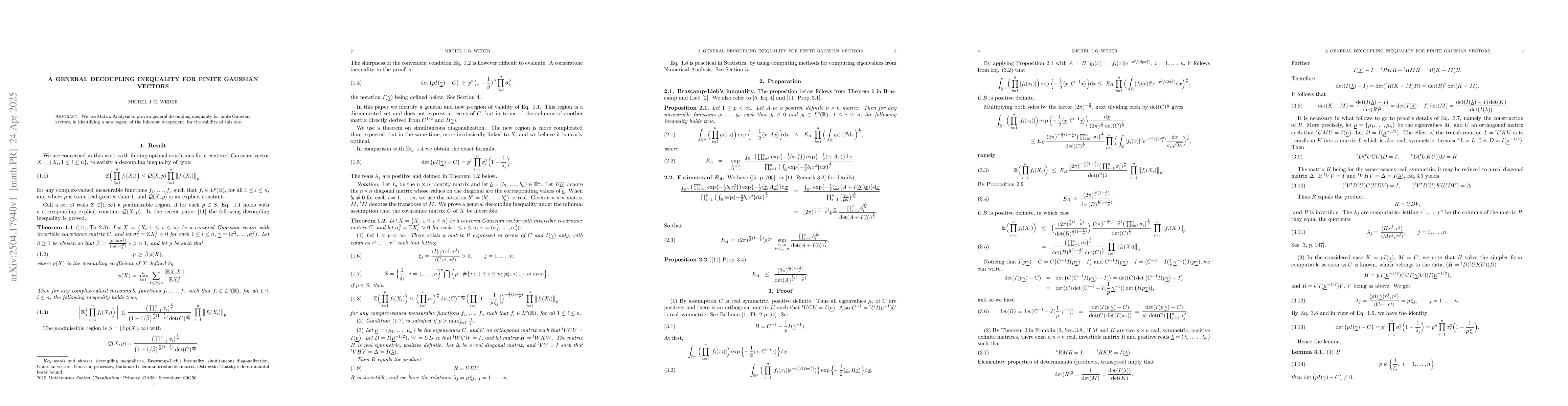 The paper presents a novel decoupling inequality for finite Gaussian vectors, derived using Matrix Analysis, which extends the understanding of the $p$ exponent's validity region.