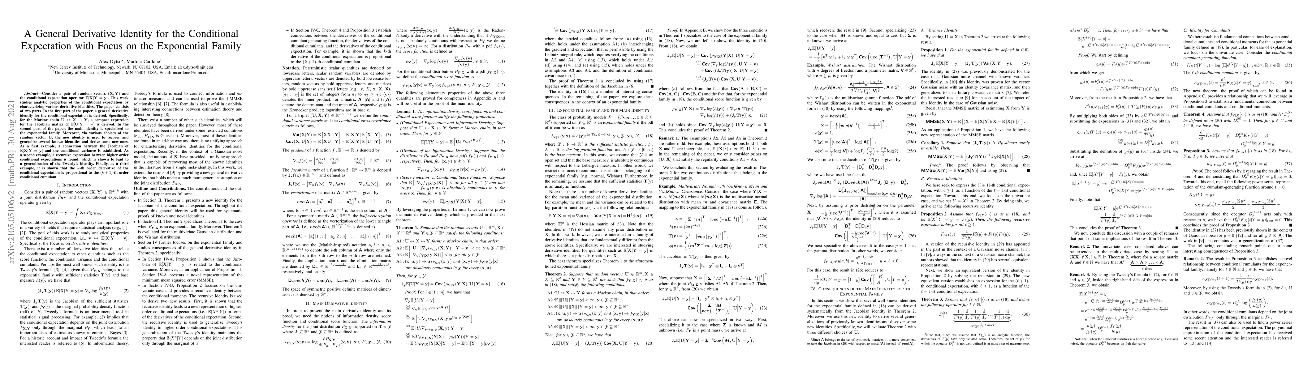 Consider a pair of random vectors $(\mathbf{X},\mathbf{Y}) $ and the conditional expectation operator $\mathbb{E}[\mathbf{X}|\mathbf{Y}=\mathbf{y}]$. This work studies analytic properties of the conditional expectation by characterizing various derivative identities. The paper consists of two parts. In the first part of the paper, a general derivative identity for the conditional expectation is derived. Specifically, for the Markov chain $\mathbf{U} \leftrightarrow \mathbf{X} \leftrightarrow \mathbf{Y}$, a compact expression for the Jacobian matrix of $\mathbb{E}[\mathbf{U}|\mathbf{Y}=\mathbf{y}]$ is derived. In the second part of the paper, the main identity is specialized to the exponential family. Moreover, via various choices of the random vector $\mathbf{U}$, the new identity is used to recover and generalize several known identities and derive some new ones. As a first example, a connection between the Jacobian of $ \mathbb{E}[\mathbf{X}|\mathbf{Y}=\mathbf{y}]$ and the conditional variance is established. As a second example, a recursive expression between higher order conditional expectations is found, which is shown to lead to a generalization of the Tweedy's identity. Finally, as a third example, it is shown that the $k$-th order derivative of the conditional expectation is proportional to the $(k+1)$-th order conditional cumulant.