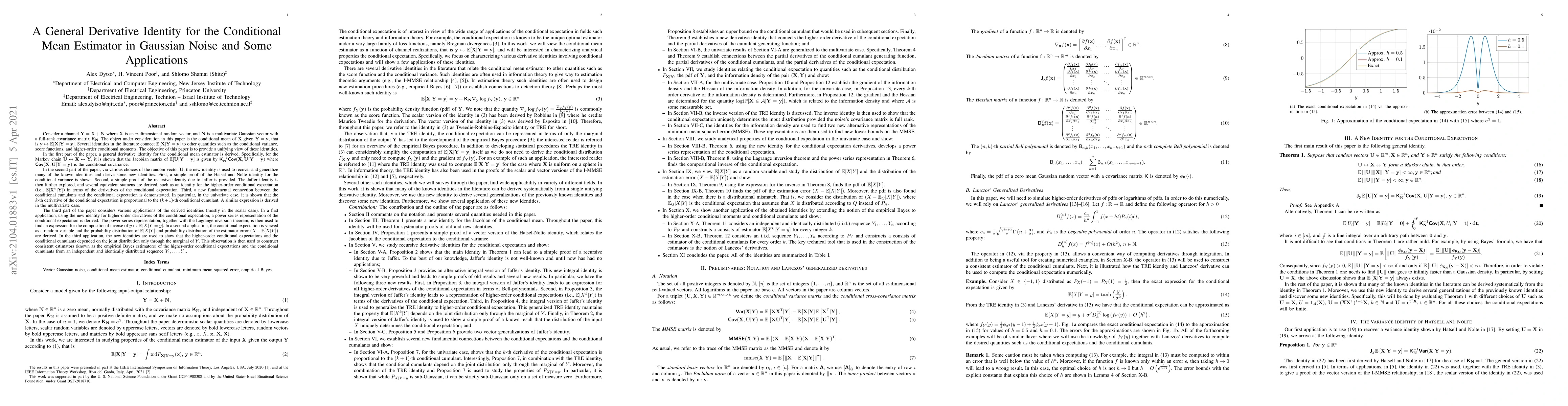 This paper derives a general derivative identity for the conditional mean estimator in Gaussian noise and explores its applications. It establishes a unifying view of existing identities and introduces new connections, such as the relationship between conditional cumulants and conditional expectations, and constructs consistent estimators for the conditional cumulants.