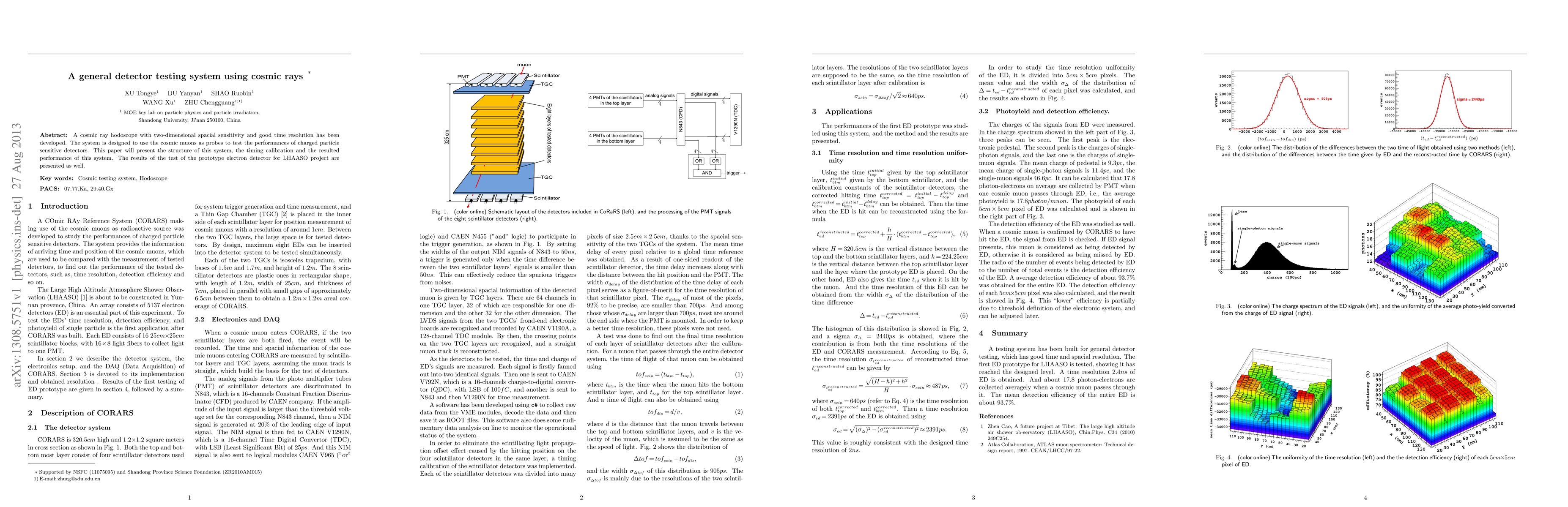 A cosmic ray hodoscope with two-dimensional spacial sensitivity and good time resolution has been developed. The system is designed to use the cosmic muons as probes to test the performances of charged particle sensitive detectors. This paper will present the structure of this system, the timing calibration and the resulted performance of this system. The results of the test of the prototype electron detector for LHAASO project are presented as well.