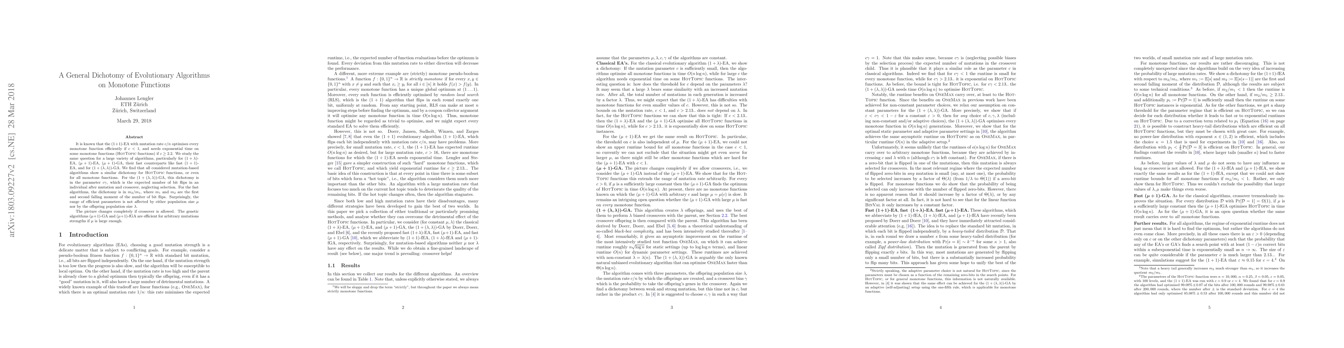This paper investigates the performance of various evolutionary algorithms on monotone functions, finding a dichotomy in optimization efficiency based on specific parameters. Mutation-based algorithms require efficient parameters to avoid exponential time, while crossover-based genetic algorithms remain efficient regardless of mutation strength if the population size is sufficiently large.