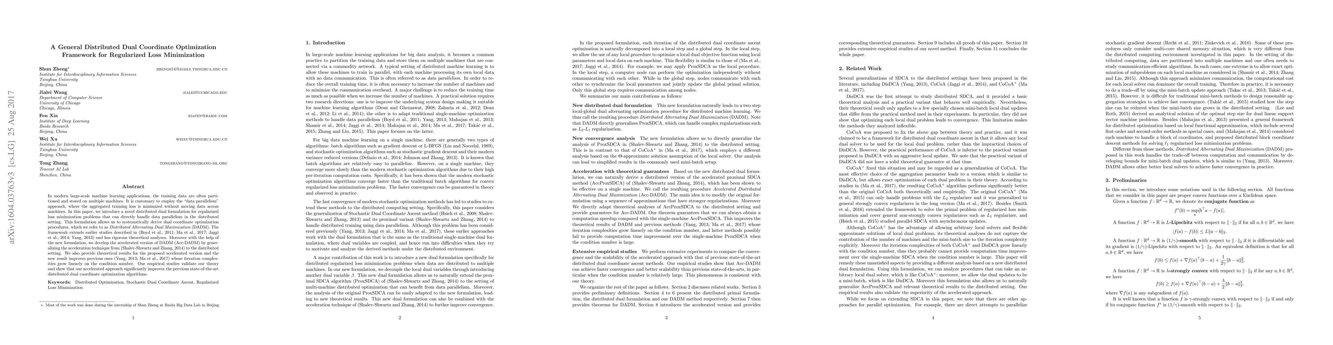 A new framework for distributed dual coordinate optimization is introduced, allowing for efficient training of large-scale machine learning models on multiple machines.