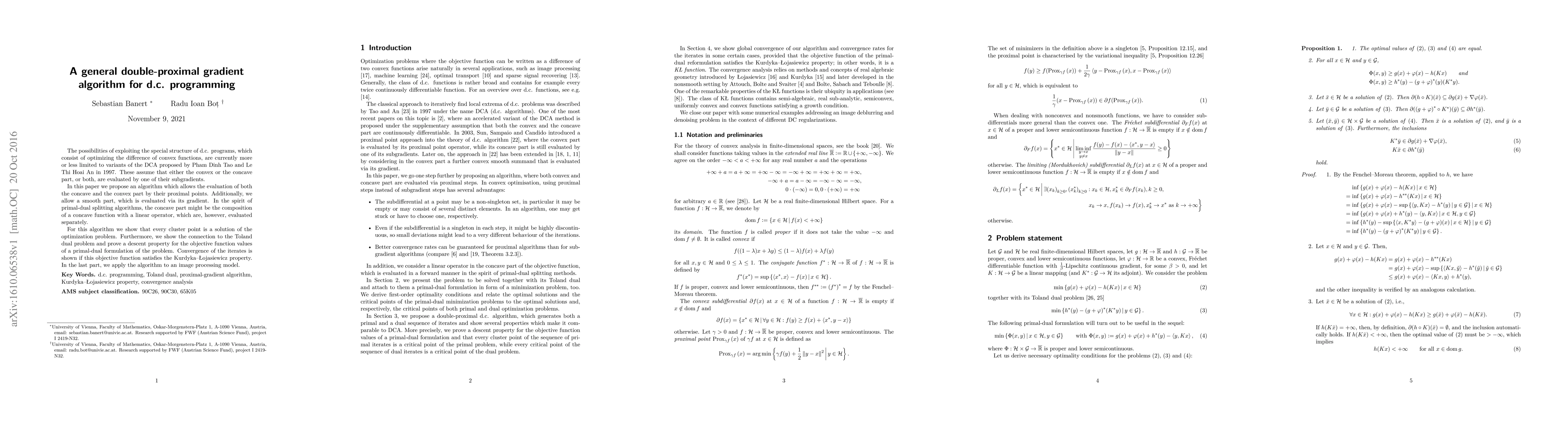 This paper introduces a novel double-proximal gradient algorithm for d.c. programming, allowing evaluation of both convex and concave parts via their proximal points and a smooth part via gradient. It demonstrates convergence under certain conditions and applies the method to an image processing model.