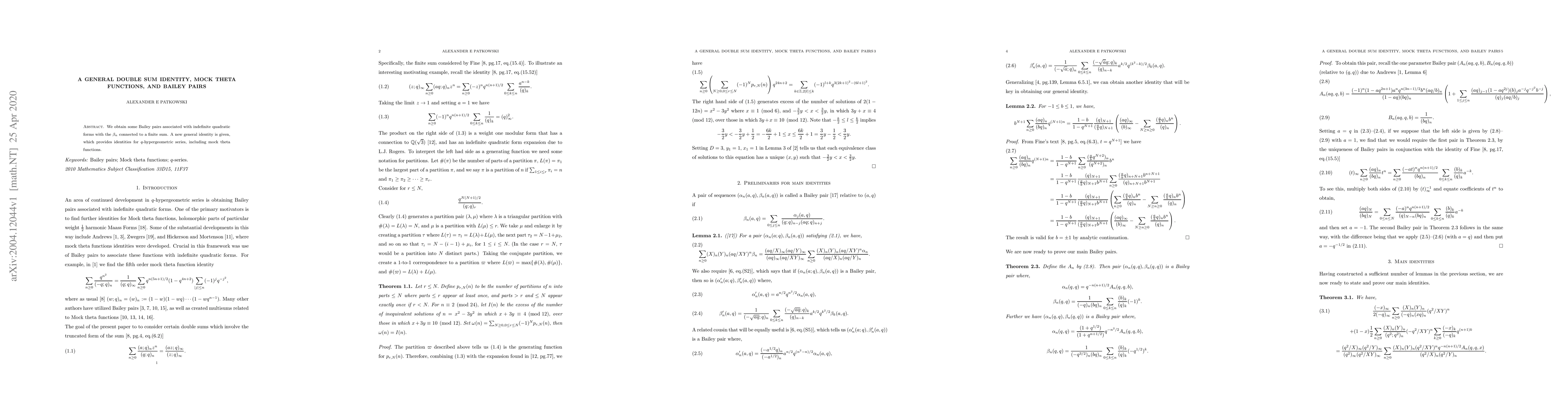 This paper presents a new general double sum identity that connects Bailey pairs to indefinite quadratic forms and finite sums, leading to identities for $q$-hypergeometric series and mock theta functions. The $\beta_n$ coefficients are linked to these series through a specific finite sum.
