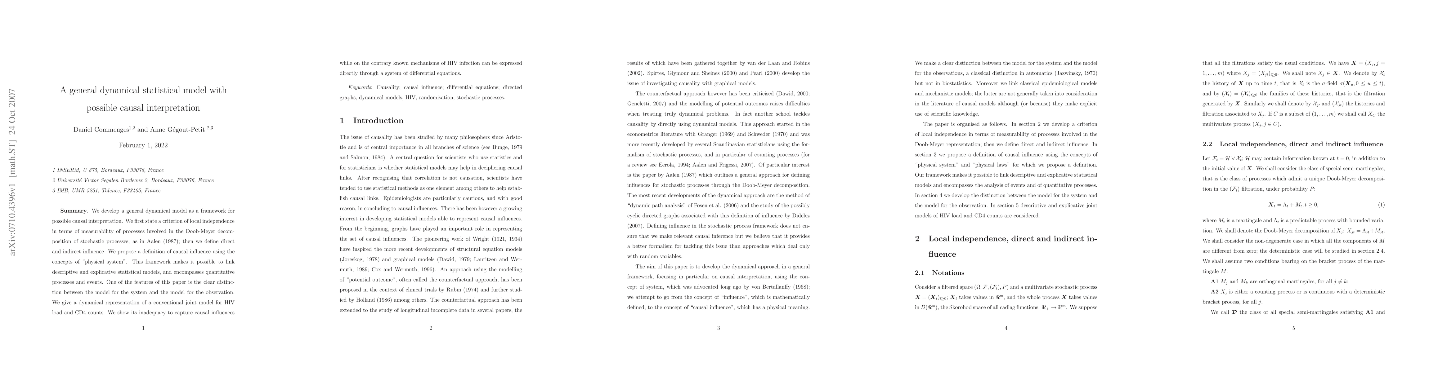 We develop a general dynamical model as a framework for possible causal interpretation. We first state a criterion of local independence in terms of measurability of processes involved in the Doob-Meyer decomposition of stochastic processes, as in Aalen (1987); then we define direct and indirect influence. We propose a definition of causal influence using the concepts of ``physical system''. This framework makes it possible to link descriptive and explicative statistical models, and encompasses quantitative processes and events. One of the features of this paper is the clear distinction between the model for the system and the model for the observation. We give a dynamical representation of a conventional joint model for HIV load and CD4 counts. We show its inadequacy to capture causal influences while on the contrary known mechanisms of HIV infection can be expressed directly through a system of differential equations.