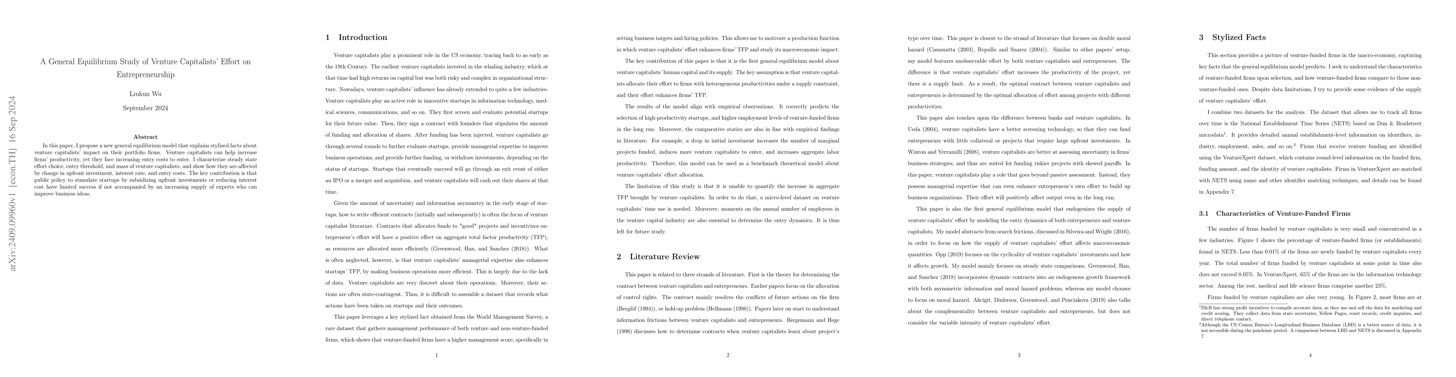 This paper develops a general equilibrium model to analyze venture capitalists' efforts on entrepreneurship, highlighting that while venture capitalists boost firm productivity, rising entry costs pose challenges. It finds that public policy subsidies for startups are ineffective without a concurrent increase in skilled experts to refine business ideas.