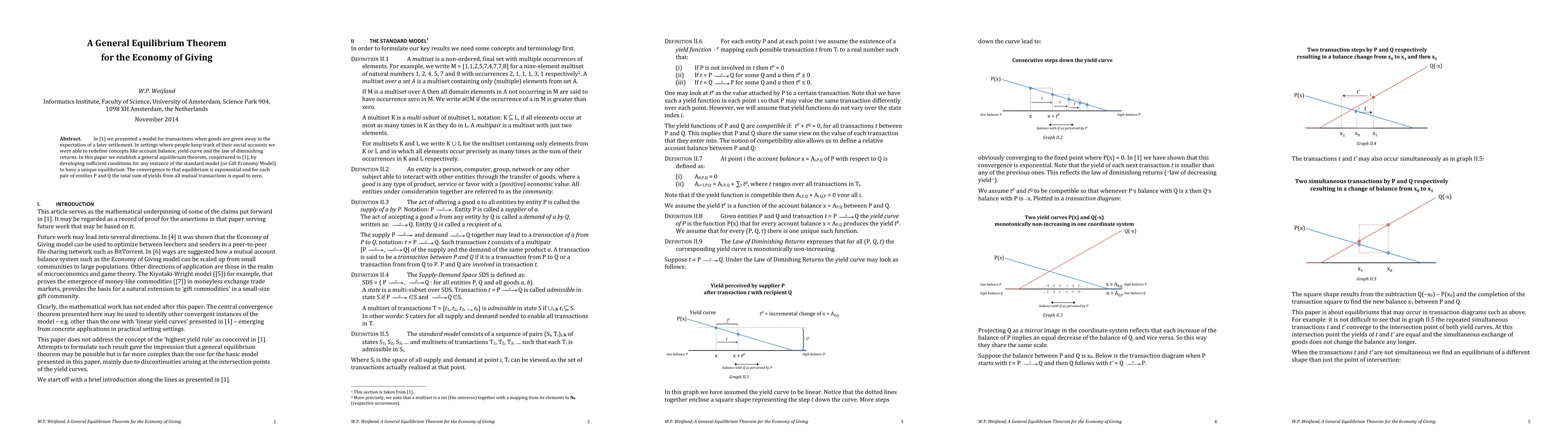In [1] we presented a model for transactions when goods are given away in the expectation of a later settlement. In settings where people keep track of their social accounts we were able to redefine concepts like account balance, yield curve and the law of diminishing returns. In this paper we establish a general equilibrium theorem, conjectured in [1], by developing sufficient conditions for any instance of the standard model (or Gift Economy Model) to have a unique equilibrium. The convergence to that equilibrium is exponential and for each pair of entities P and Q the total sum of yields from all mutual transactions is equal to zero. [1] W.P. Weijland, Mathematical Foundations for the Economy of Giving, ArXiv Categories: q-fin.GN, Report 1401.4664, 2014.