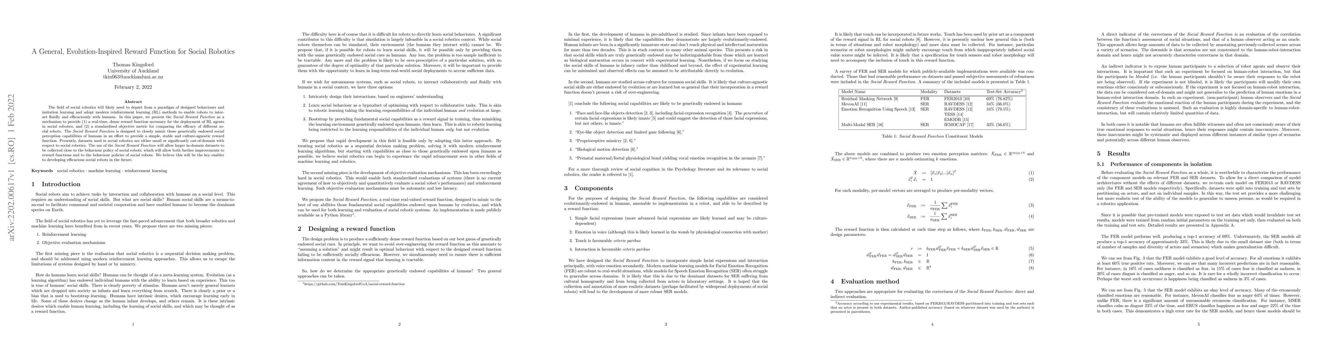 The field of social robotics will likely need to depart from a paradigm of designed behaviours and imitation learning and adopt modern reinforcement learning (RL) methods to enable robots to interact fluidly and efficaciously with humans. In this paper, we present the Social Reward Function as a mechanism to provide (1) a real-time, dense reward function necessary for the deployment of RL agents in social robotics, and (2) a standardised objective metric for comparing the efficacy of different social robots. The Social Reward Function is designed to closely mimic those genetically endowed social perception capabilities of humans in an effort to provide a simple, stable and culture-agnostic reward function. Presently, datasets used in social robotics are either small or significantly out-of-domain with respect to social robotics. The use of the Social Reward Function will allow larger in-domain datasets to be collected close to the behaviour policy of social robots, which will allow both further improvements to reward functions and to the behaviour policies of social robots. We believe this will be the key enabler to developing efficacious social robots in the future.