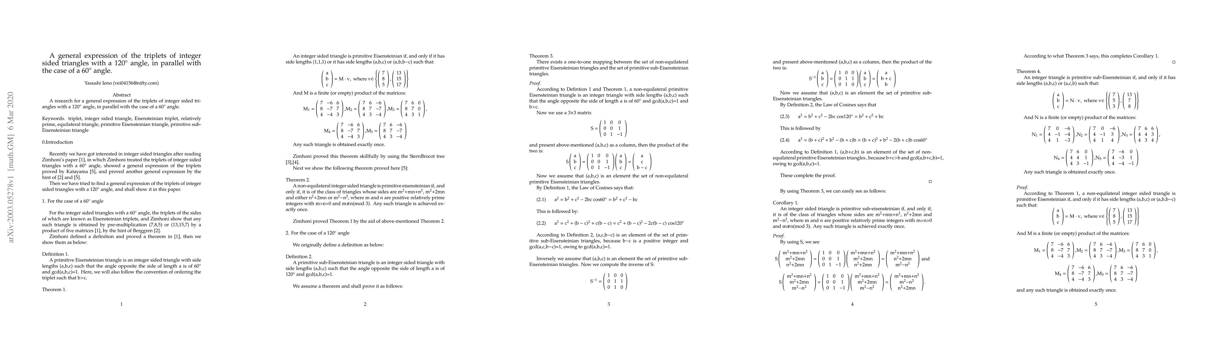This paper develops a general expression for triplets of integer-sided triangles with a $120^{\circ}$ angle, drawing parallels to the known case of triangles with a $60^{\circ}$ angle. The findings provide new insights into the geometric properties of such triangles.