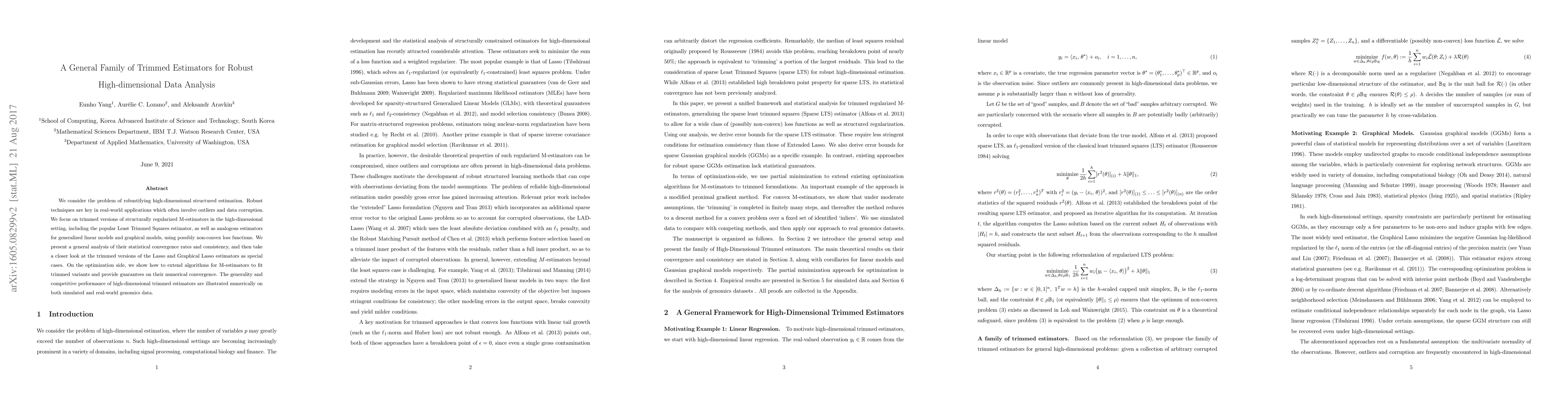 This paper proposes a family of trimmed estimators for robust high-dimensional data analysis, focusing on trimmed versions of structurally regularized M-estimators. It analyzes their statistical convergence rates and consistency, and demonstrates competitive performance on simulated and real genomics data.
