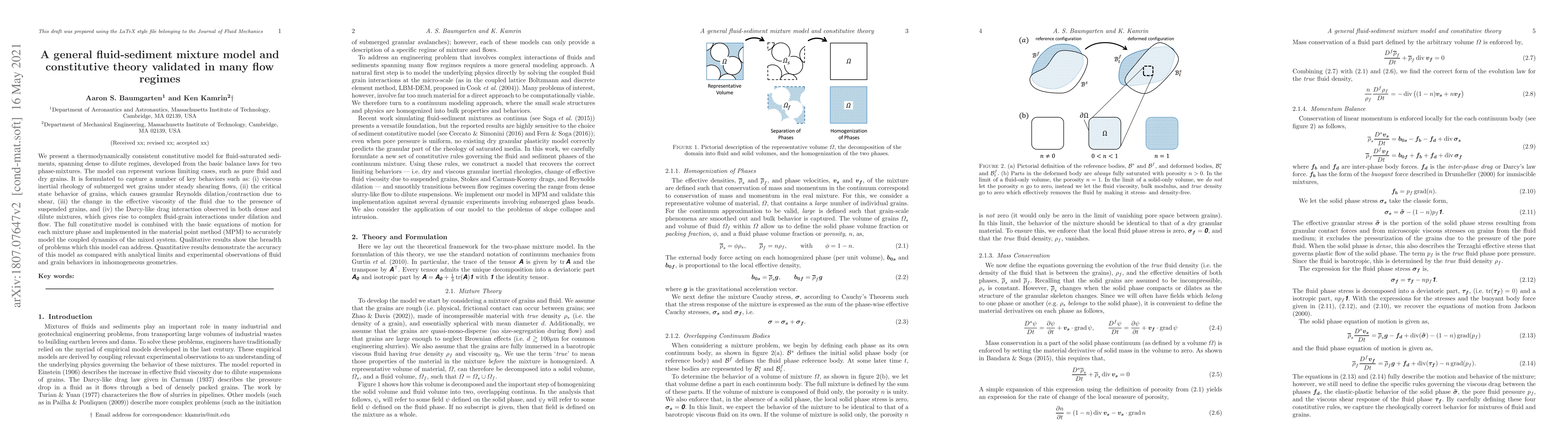 We present a thermodynamically consistent constitutive model for fluid-saturated sediments, spanning dense to dilute regimes, developed from the basic balance laws for two phase-mixtures. The model can represent various limiting cases, such as pure fluid and dry grains. It is formulated to capture a number of key behaviors such as: (i) viscous inertial rheology of submerged wet grains under steady shearing flows, (ii) the critical state behavior of grains, which causes granular Reynolds dilation/contraction due to shear, (iii) the viscous thickening of the fluid response due to the presence of suspended grains, and (iv) the Darcy-like drag interaction observed in both dense and dilute mixtures, which gives rise to complex fluid-grain interactions under dilation and flow. The full constitutive model is combined with the basic equations of motion for each mixture phase and implemented in the material point method (MPM) to accurately model the coupled dynamics of the mixed system. Qualitative results show the breadth of problems which this model can address. Quantitative results demonstrate the accuracy of this model as compared with analytical limits and experimental observations of fluid and grain behaviors in inhomogeneous geometries.