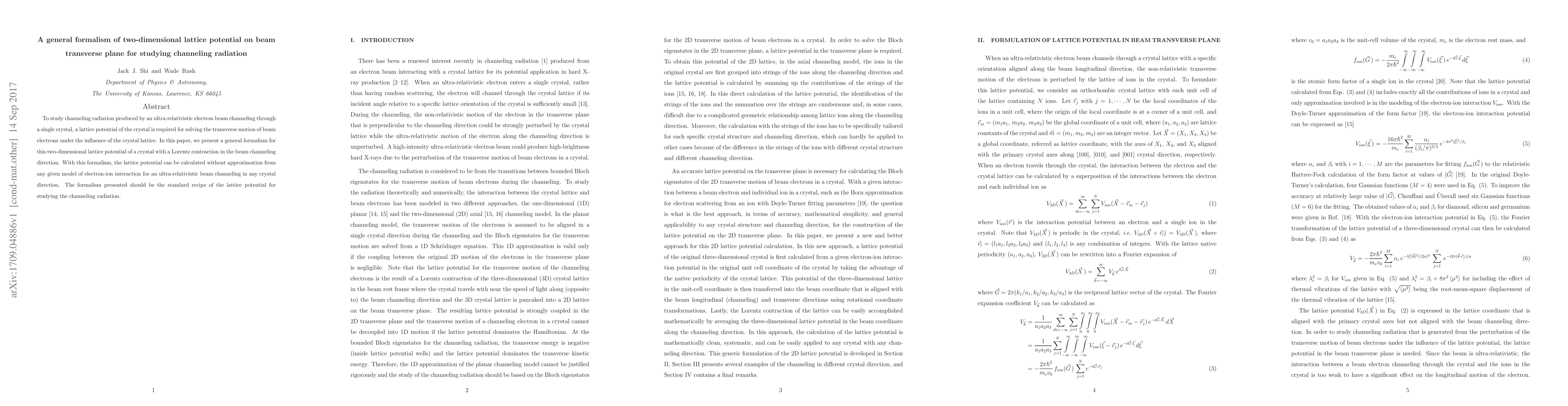This paper introduces a general formalism for calculating the two-dimensional lattice potential in crystals for studying channeling radiation from ultra-relativistic electron beams. The formalism accounts for Lorentz contraction and allows for precise calculations without approximations, applicable to any electron-ion interaction model.