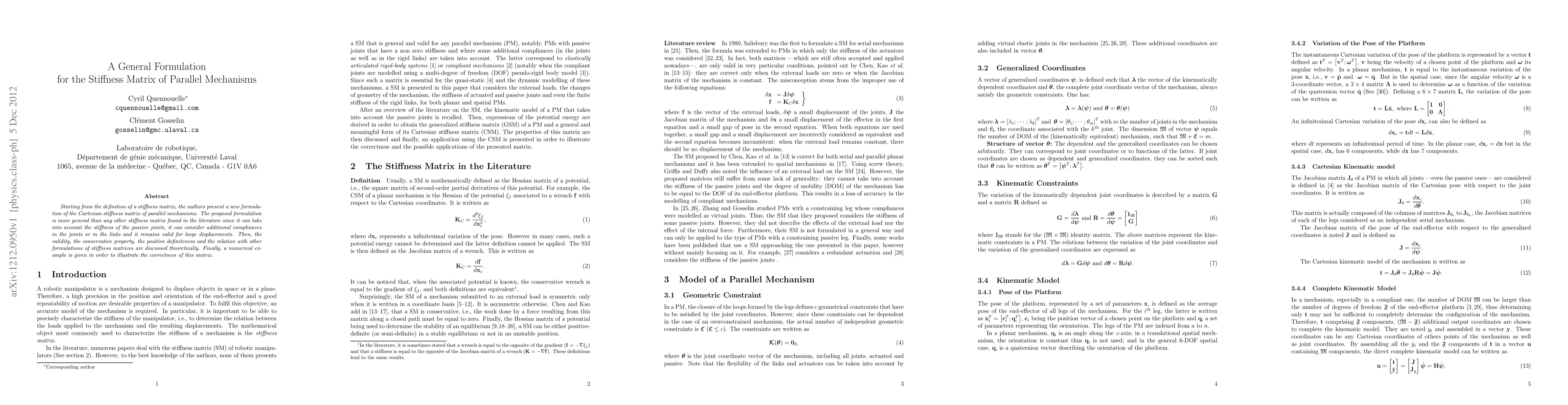 A new formulation for the stiffness matrix of parallel mechanisms is proposed, allowing consideration of passive joint stiffness and additional compliances, with implications for design and analysis.