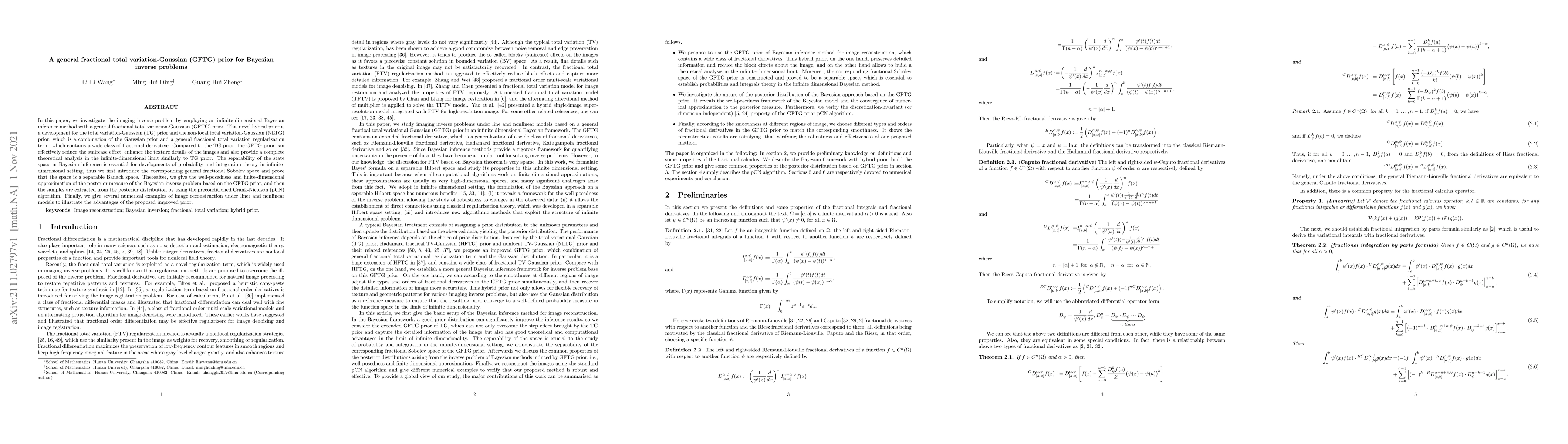 In this paper, we investigate the imaging inverse problem by employing an infinite-dimensional Bayesian inference method with a general fractional total variation-Gaussian (GFTG) prior. This novel hybrid prior is a development for the total variation-Gaussian (TG) prior and the non-local total variation-Gaussian (NLTG) prior, which is a combination of the Gaussian prior and a general fractional total variation regularization term, which contains a wide class of fractional derivative. Compared to the TG prior, the GFTG prior can effectively reduce the staircase effect, enhance the texture details of the images and also provide a complete theoretical analysis in the infinite-dimensional limit similarly to TG prior. The separability of the state space in Bayesian inference is essential for developments of probability and integration theory in infinite-dimensional setting, thus we first introduce the corresponding general fractional Sobolev space and prove that the space is a separable Banach space. Thereafter, we give the well-posedness and finite-dimensional approximation of the posterior measure of the Bayesian inverse problem based on the GFTG prior, and then the samples are extracted from the posterior distribution by using the preconditioned Crank-Nicolson (pCN) algorithm. Finally, we give several numerical examples of image reconstruction under liner and nonlinear models to illustrate the advantages of the proposed improved prior.