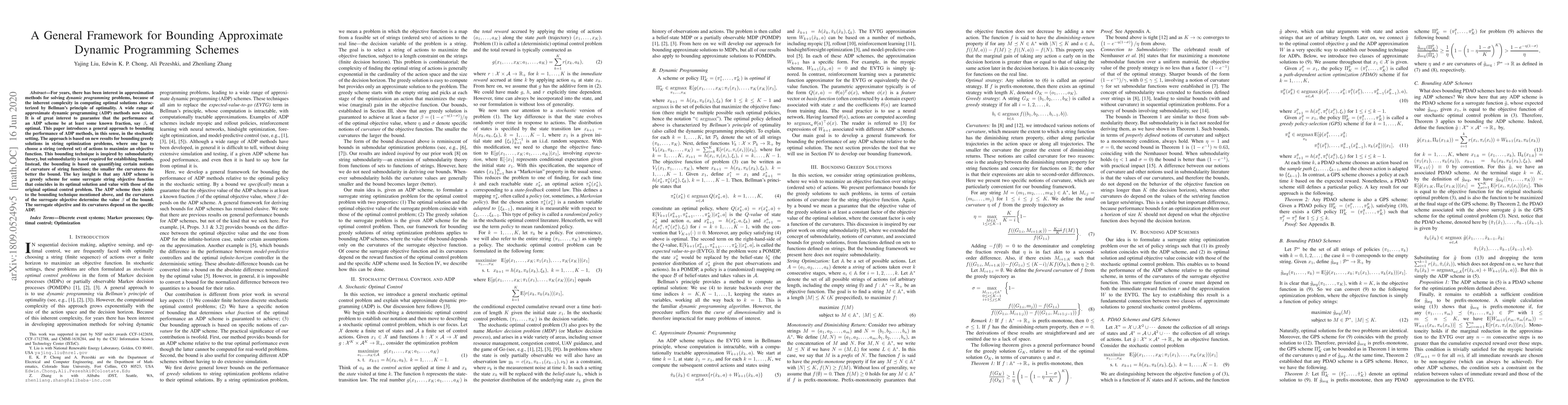 For years, there has been interest in approximation methods for solving dynamic programming problems, because of the inherent complexity in computing optimal solutions characterized by Bellman's principle of optimality. A wide range of approximate dynamic programming (ADP) methods now exists. It is of great interest to guarantee that the performance of an ADP scheme be at least some known fraction, say $\beta$, of optimal. This paper introduces a general approach to bounding the performance of ADP methods, in this sense, in the stochastic setting. The approach is based on new results for bounding greedy solutions in string optimization problems, where one has to choose a string (ordered set) of actions to maximize an objective function. This bounding technique is inspired by submodularity theory, but submodularity is not required for establishing bounds. Instead, the bounding is based on quantifying certain notions of curvature of string functions; the smaller the curvatures the better the bound. The key insight is that any ADP scheme is a greedy scheme for some surrogate string objective function that coincides in its optimal solution and value with those of the original optimal control problem. The ADP scheme then yields to the bounding technique mentioned above, and the curvatures of the surrogate objective determine the value $\beta$ of the bound. The surrogate objective and its curvatures depend on the specific ADP.