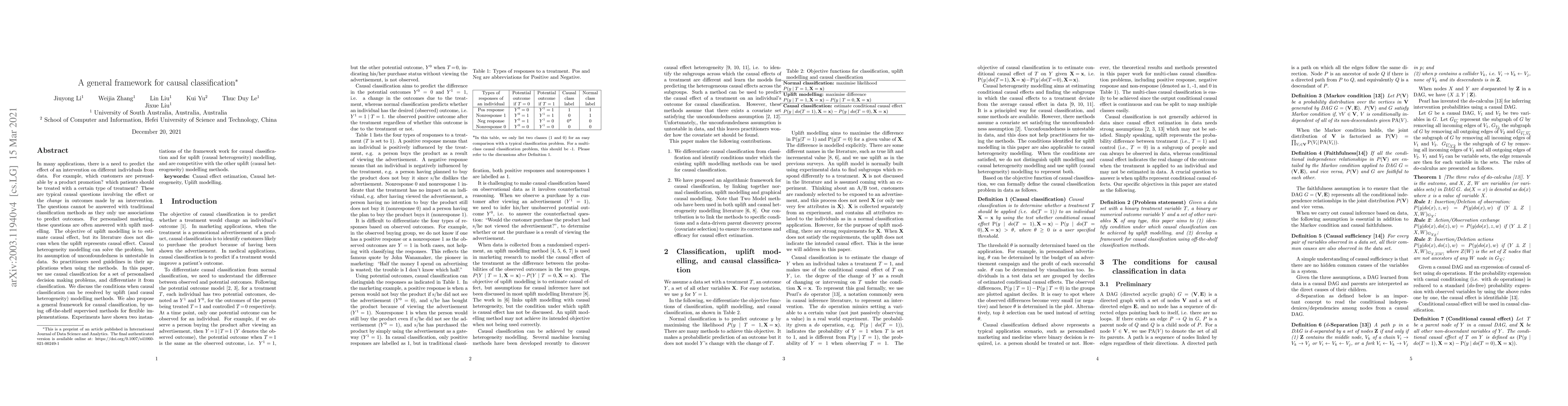 The paper presents a general framework for causal classification, a theorem that identifies conditions for causal classification in observational data, and links uplift modelling with causal heterogeneity modelling.