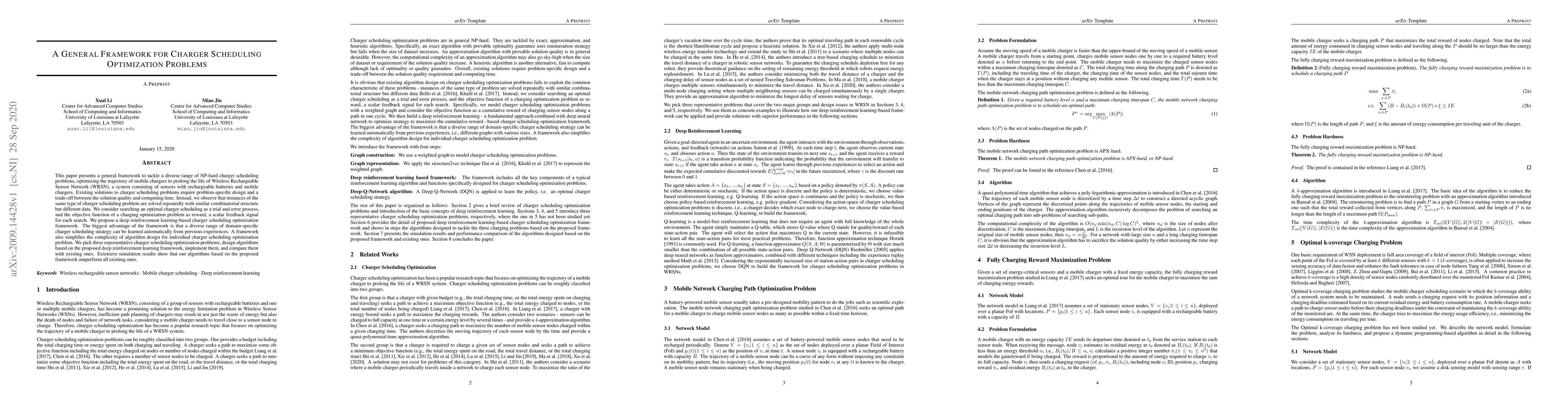 This paper introduces a deep reinforcement learning framework for charger scheduling optimization in Wireless Rechargeable Sensor Networks, enabling the automatic learning of diverse strategies from past experiences to outperform existing methods. Simulation results confirm the framework’s superiority in solving various charger scheduling problems.