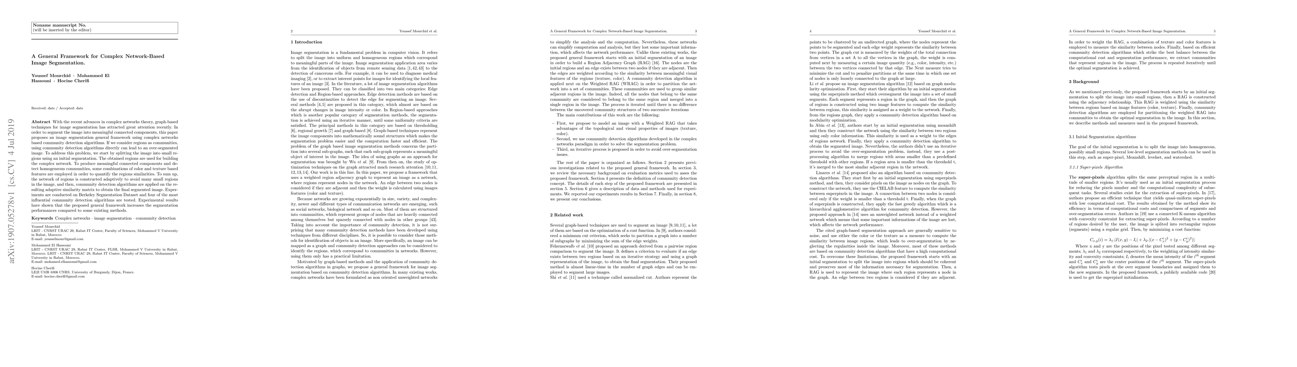 This paper proposes a general framework for image segmentation using complex network theory and community detection algorithms. It adaptively constructs a network of regions based on color and texture features to avoid over-segmentation, followed by applying community detection to obtain meaningful connected components, demonstrating improved performance over existing methods on the Berkeley Segmentation Dataset.