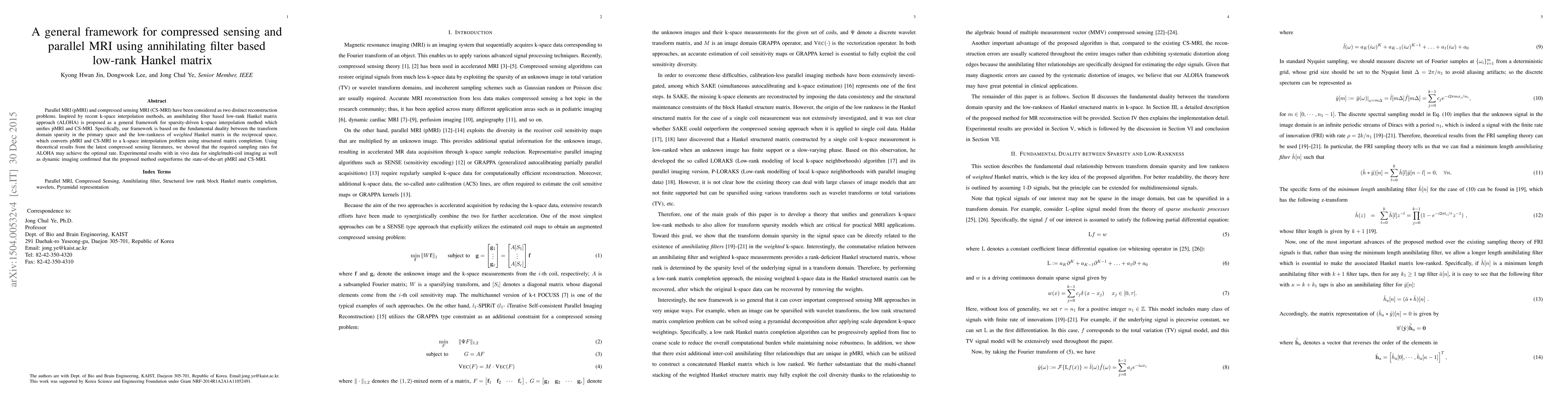 This paper proposes a unified framework for parallel and compressed sensing MRI reconstruction using an annihilating filter-based low-rank Hankel matrix approach (ALOHA). The method leverages the duality between sparsity in the transform domain and low-rankness in the reciprocal space to solve both parallel and compressed sensing MRI through k-space interpolation, achieving optimal sampling rates and outperforming existing methods in experimental validations.
