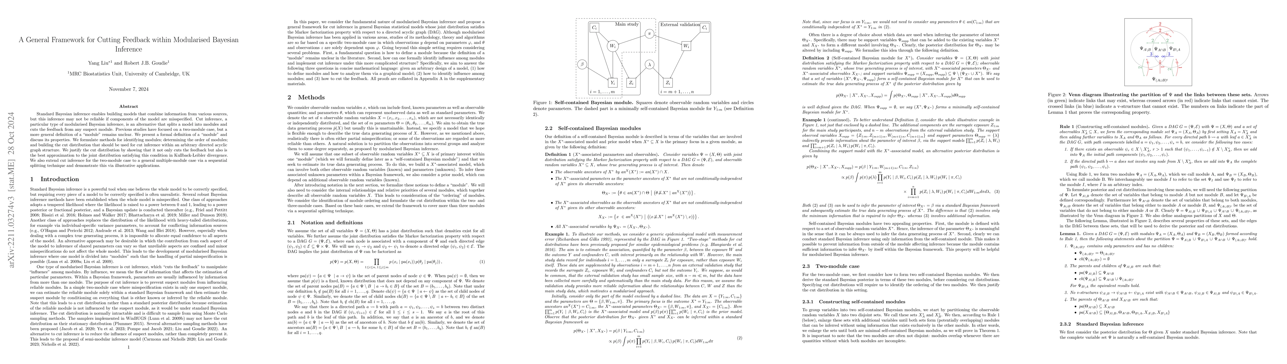 This paper introduces a general framework for cut inference in modularized Bayesian inference, defining "module" formally and providing methods for identifying and ordering modules. It justifies the cut distribution as the best approximation to the joint distribution while cutting feedback, and extends the two-module cut inference to multiple modules using a sequential splitting technique.