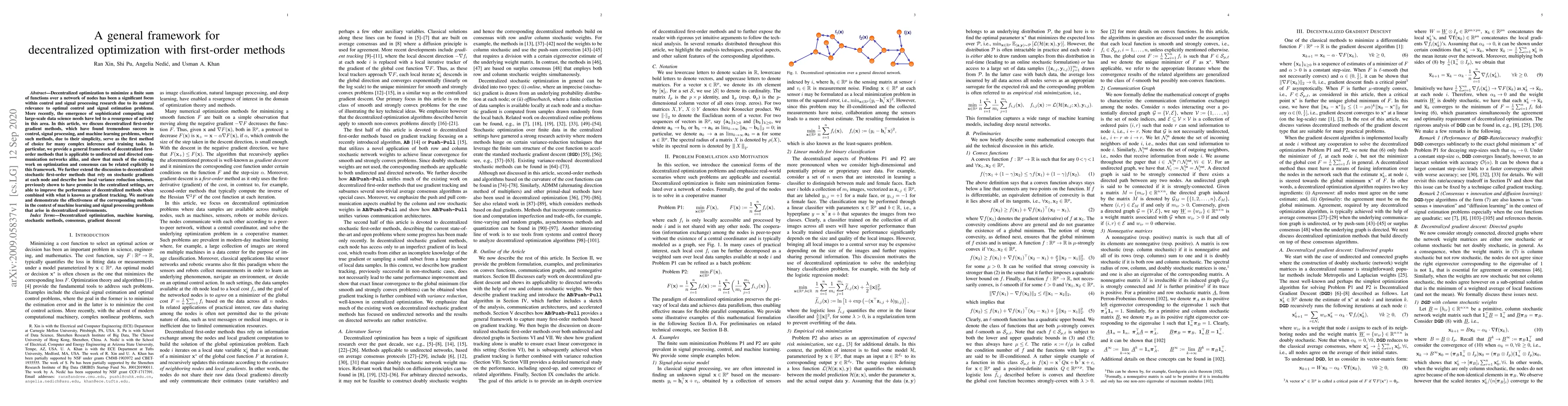 A general framework for decentralized optimization with first-order methods is presented, allowing for efficient solution of complex inference and training tasks in distributed networks. The framework includes stochastic gradient methods that improve performance when combined with local variance reduction schemes and gradient tracking.