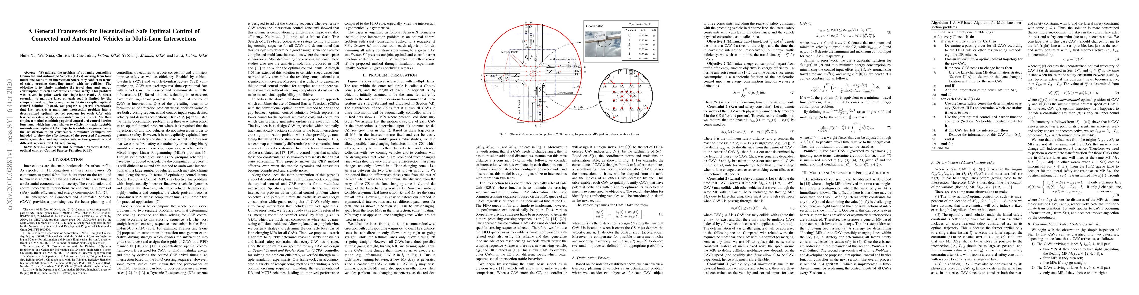This paper proposes a decentralized framework for optimal control of Connected and Automated Vehicles (CAVs) at multi-lane intersections, minimizing travel time and energy while ensuring safety. It employs a combination of optimal control and control barrier functions to efficiently manage computational complexity and guarantee constraint satisfaction.