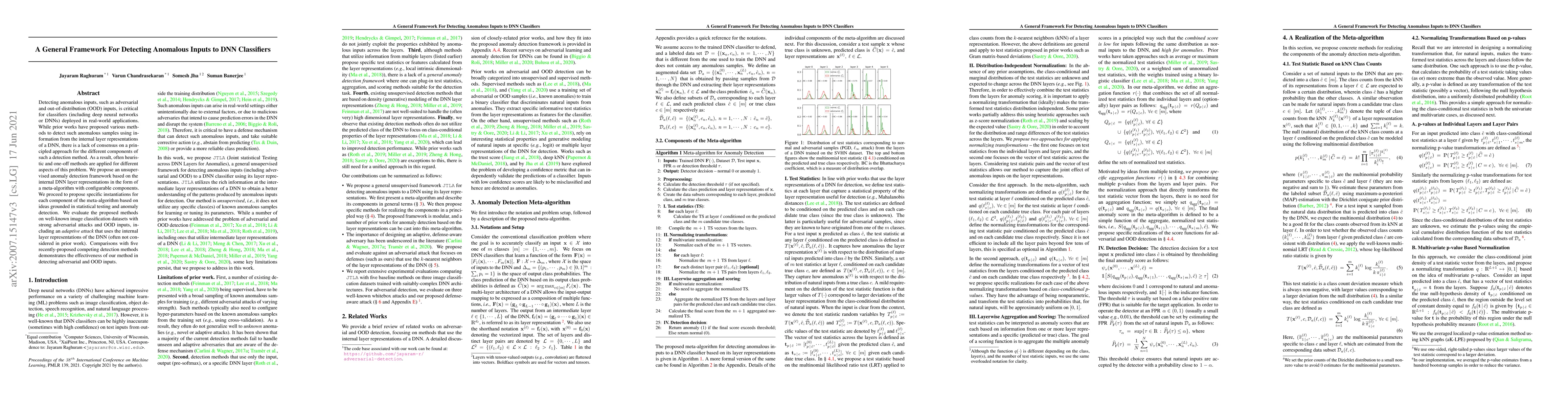 Detecting anomalous inputs, such as adversarial and out-of-distribution (OOD) inputs, is critical for classifiers (including deep neural networks or DNNs) deployed in real-world applications. While prior works have proposed various methods to detect such anomalous samples using information from the internal layer representations of a DNN, there is a lack of consensus on a principled approach for the different components of such a detection method. As a result, often heuristic and one-off methods are applied for different aspects of this problem. We propose an unsupervised anomaly detection framework based on the internal DNN layer representations in the form of a meta-algorithm with configurable components. We proceed to propose specific instantiations for each component of the meta-algorithm based on ideas grounded in statistical testing and anomaly detection. We evaluate the proposed methods on well-known image classification datasets with strong adversarial attacks and OOD inputs, including an adaptive attack that uses the internal layer representations of the DNN (often not considered in prior work). Comparisons with five recently-proposed competing detection methods demonstrates the effectiveness of our method in detecting adversarial and OOD inputs.