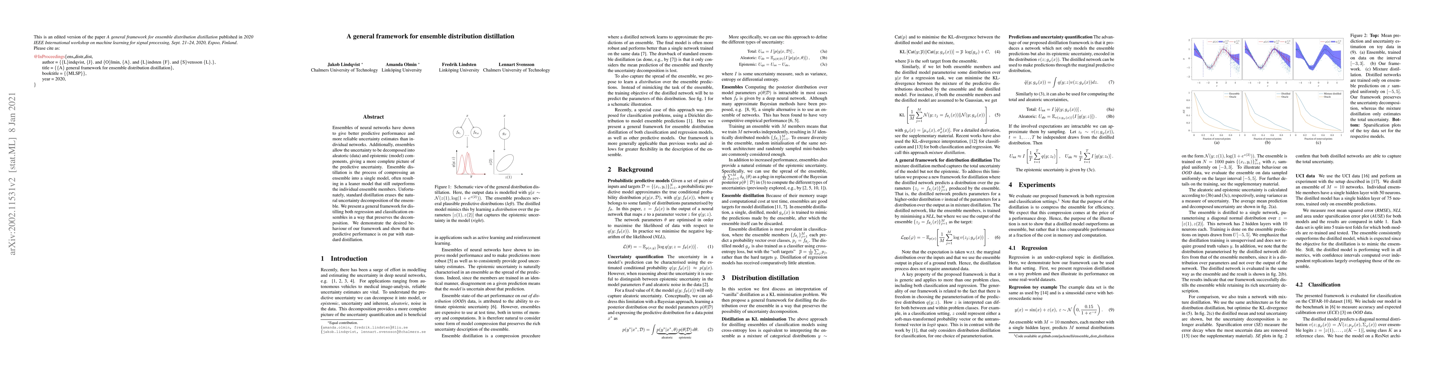 This paper introduces a framework for ensemble distribution distillation that compresses neural network ensembles into a single model while preserving the decomposition of predictive uncertainty into aleatoric and epistemic components. The proposed method maintains the performance of standard distillation while retaining the ensemble's uncertainty structure.