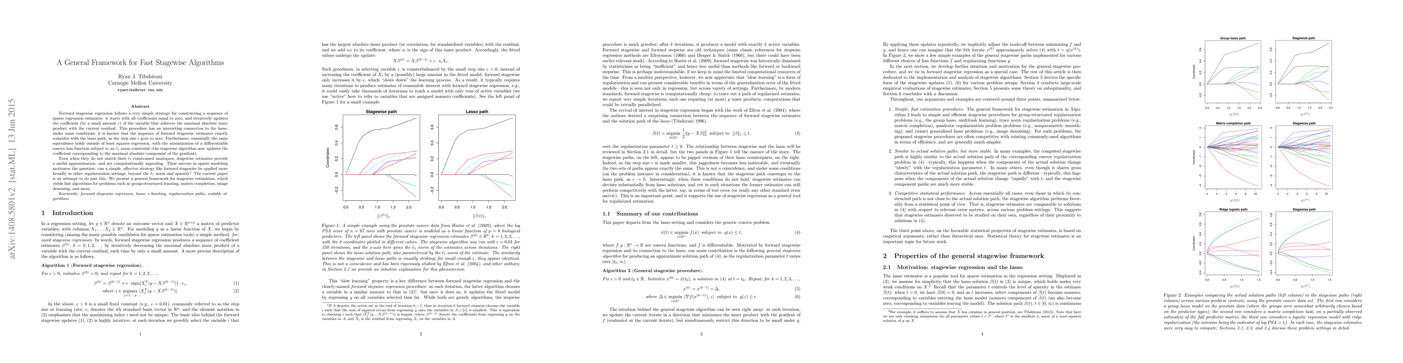 Forward stagewise regression follows a very simple strategy for constructing a sequence of sparse regression estimates: it starts with all coefficients equal to zero, and iteratively updates the coefficient (by a small amount $\epsilon$) of the variable that achieves the maximal absolute inner product with the current residual. This procedure has an interesting connection to the lasso: under some conditions, it is known that the sequence of forward stagewise estimates exactly coincides with the lasso path, as the step size $\epsilon$ goes to zero. Furthermore, essentially the same equivalence holds outside of least squares regression, with the minimization of a differentiable convex loss function subject to an $\ell_1$ norm constraint (the stagewise algorithm now updates the coefficient corresponding to the maximal absolute component of the gradient). Even when they do not match their $\ell_1$-constrained analogues, stagewise estimates provide a useful approximation, and are computationally appealing. Their success in sparse modeling motivates the question: can a simple, effective strategy like forward stagewise be applied more broadly in other regularization settings, beyond the $\ell_1$ norm and sparsity? The current paper is an attempt to do just this. We present a general framework for stagewise estimation, which yields fast algorithms for problems such as group-structured learning, matrix completion, image denoising, and more.