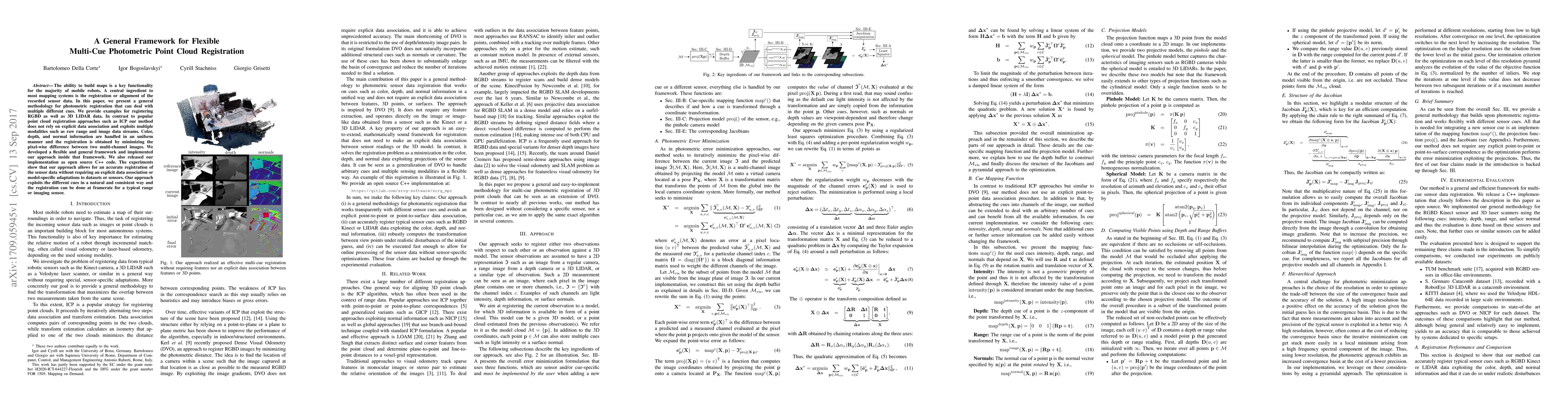 This paper introduces a general framework for flexible multi-cue photometric registration of point cloud data, capable of handling RGBD and 3D LIDAR data without explicit data association. The method integrates color, depth, and normal information uniformly and achieves registration by minimizing pixel-wise differences between multi-channel images, demonstrating accurate and efficient performance.