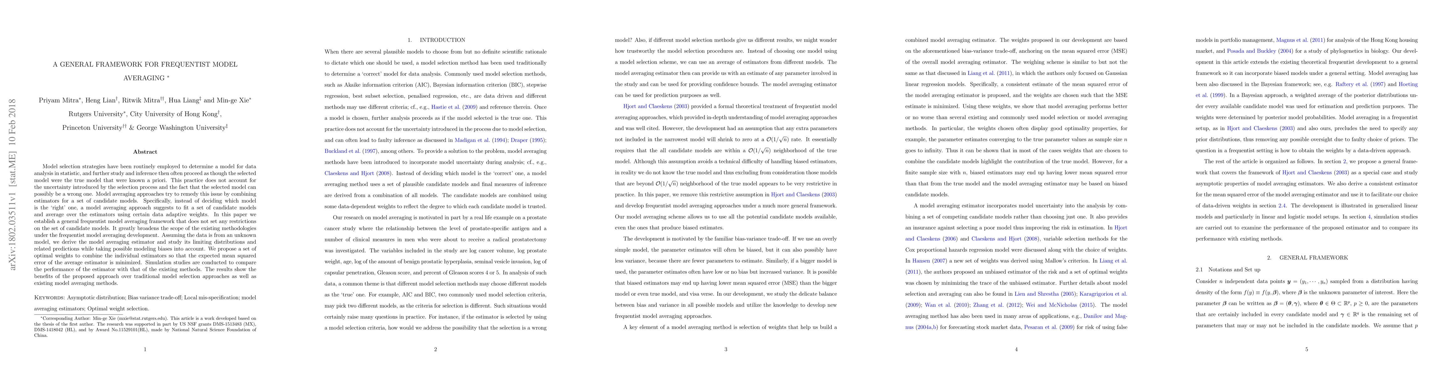 Model selection strategies have been routinely employed to determine a model for data analysis in statistics, and further study and inference then often proceed as though the selected model were the true model that were known a priori. This practice does not account for the uncertainty introduced by the selection process and the fact that the selected model can possibly be a wrong one. Model averaging approaches try to remedy this issue by combining estimators for a set of candidate models. Specifically, instead of deciding which model is the 'right' one, a model averaging approach suggests to fit a set of candidate models and average over the estimators using certain data adaptive weights. In this paper we establish a general frequentist model averaging framework that does not set any restrictions on the set of candidate models. It greatly broadens the scope of the existing methodologies under the frequentist model averaging development. Assuming the data is from an unknown model, we derive the model averaging estimator and study its limiting distributions and related predictions while taking possible modeling biases into account. We propose a set of optimal weights to combine the individual estimators so that the expected mean squared error of the average estimator is minimized. Simulation studies are conducted to compare the performance of the estimator with that of the existing methods. The results show the benefits of the proposed approach over traditional model selection approaches as well as existing model averaging methods.