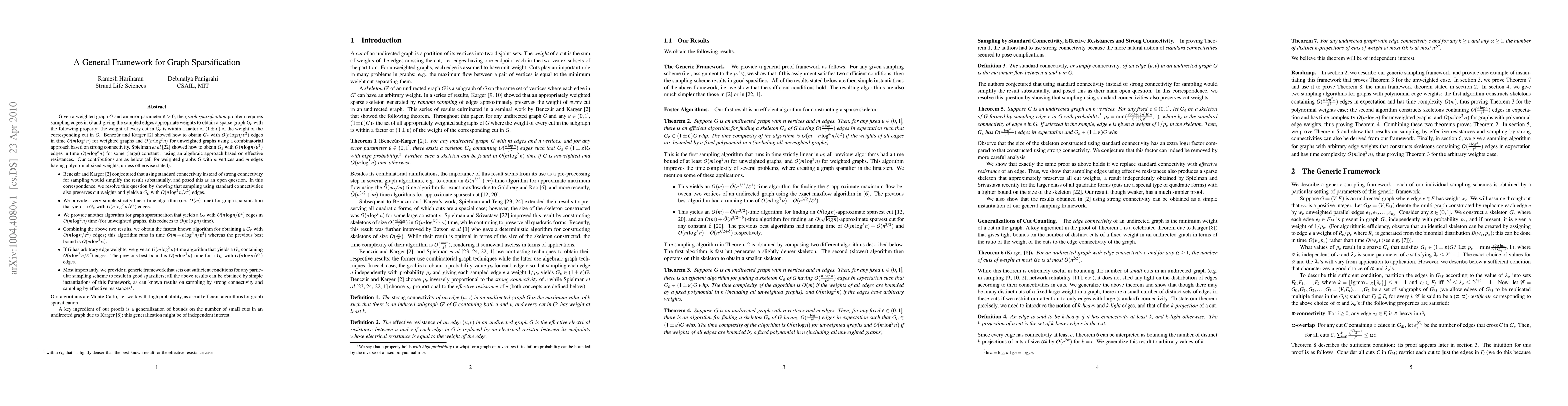 Given a weighted graph $G$ and an error parameter $\epsilon > 0$, the {\em graph sparsification} problem requires sampling edges in $G$ and giving the sampled edges appropriate weights to obtain a sparse graph $G_{\epsilon}$ (containing O(n\log n) edges in expectation) with the following property: the weight of every cut in $G_{\epsilon}$ is within a factor of $(1\pm \epsilon)$ of the weight of the corresponding cut in $G$. We provide a generic framework that sets out sufficient conditions for any particular sampling scheme to result in good sparsifiers, and obtain a set of results by simple instantiations of this framework. The results we obtain include the following: (1) We improve the time complexity of graph sparsification from O(m\log^3 n) to O(m + n\log^4 n) for graphs with polynomial edge weights. (2) We improve the time complexity of graph sparsification from O(m\log^3 n) to O(m\log^2 n) for graphs with arbitrary edge weights. (3) If the size of the sparsifier is allowed to be O(n\log^2 n/\epsilon^2) instead of O(n\log n/\epsilon^2), we improve the time complexity of sparsification to O(m) for graphs with polynomial edge weights. (4) We show that sampling using standard connectivities results in good sparsifiers, thus resolving an open question of Benczur and Karger. As a corollary, we give a simple proof of (a slightly weaker version of) a result due to Spielman and Srivastava showing that sampling using effective resistances produces good sparsifiers. (5) We give a simple proof showing that sampling using strong connectivities results in good sparsifiers, a result obtained previously using a more involved proof by Benczur and Karger. A key ingredient of our proofs is a generalization of bounds on the number of small cuts in an undirected graph due to Karger; this generalization might be of independent interest.