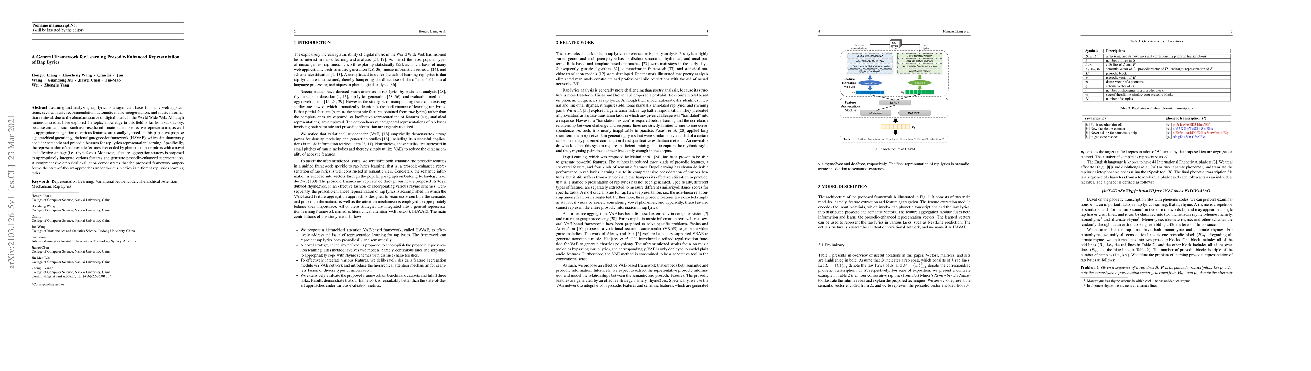 This paper proposes a hierarchical attention variational autoencoder framework (HAVAE) to learn prosodic-enhanced representations of rap lyrics, integrating semantic and prosodic features through phonetic transcriptions and a novel rhyme2vec strategy. The framework outperforms existing methods in various tasks, demonstrating its effectiveness.