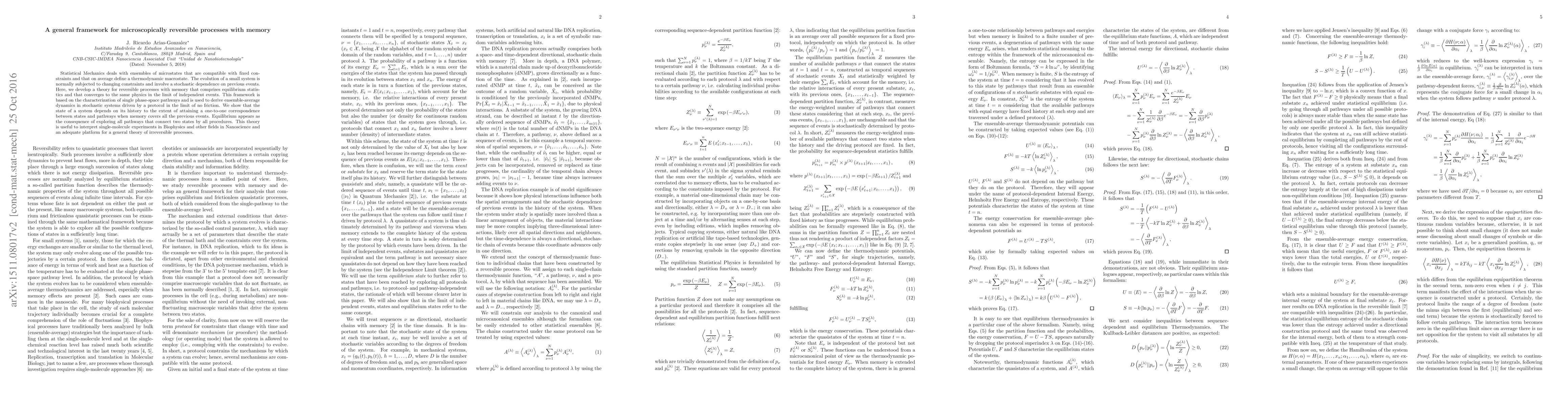This paper presents a theoretical framework for microscopically reversible processes with memory, showing how equilibrium statistics emerge from the exploration of all pathways connecting states, and applies this to interpret single-molecule experiments in Biophysics and Nanoscience. The framework characterizes single phase-space pathways to derive ensemble-average dynamics in stochastic systems.