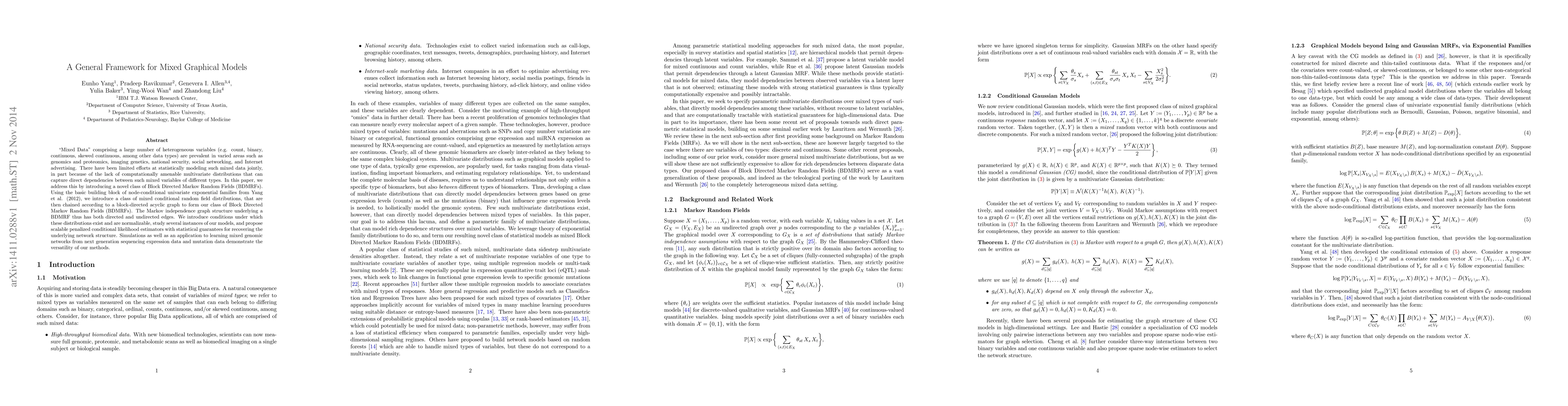 "Mixed Data" comprising a large number of heterogeneous variables (e.g. count, binary, continuous, skewed continuous, among other data types) are prevalent in varied areas such as genomics and proteomics, imaging genetics, national security, social networking, and Internet advertising. There have been limited efforts at statistically modeling such mixed data jointly, in part because of the lack of computationally amenable multivariate distributions that can capture direct dependencies between such mixed variables of different types. In this paper, we address this by introducing a novel class of Block Directed Markov Random Fields (BDMRFs). Using the basic building block of node-conditional univariate exponential families from Yang et al. (2012), we introduce a class of mixed conditional random field distributions, that are then chained according to a block-directed acyclic graph to form our class of Block Directed Markov Random Fields (BDMRFs). The Markov independence graph structure underlying a BDMRF thus has both directed and undirected edges. We introduce conditions under which these distributions exist and are normalizable, study several instances of our models, and propose scalable penalized conditional likelihood estimators with statistical guarantees for recovering the underlying network structure. Simulations as well as an application to learning mixed genomic networks from next generation sequencing expression data and mutation data demonstrate the versatility of our methods.