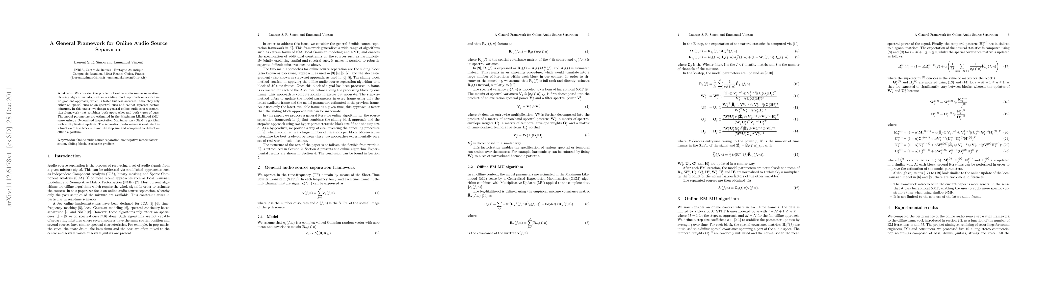 We consider the problem of online audio source separation. Existing algorithms adopt either a sliding block approach or a stochastic gradient approach, which is faster but less accurate. Also, they rely either on spatial cues or on spectral cues and cannot separate certain mixtures. In this paper, we design a general online audio source separation framework that combines both approaches and both types of cues. The model parameters are estimated in the Maximum Likelihood (ML) sense using a Generalised Expectation Maximisation (GEM) algorithm with multiplicative updates. The separation performance is evaluated as a function of the block size and the step size and compared to that of an offline algorithm.
