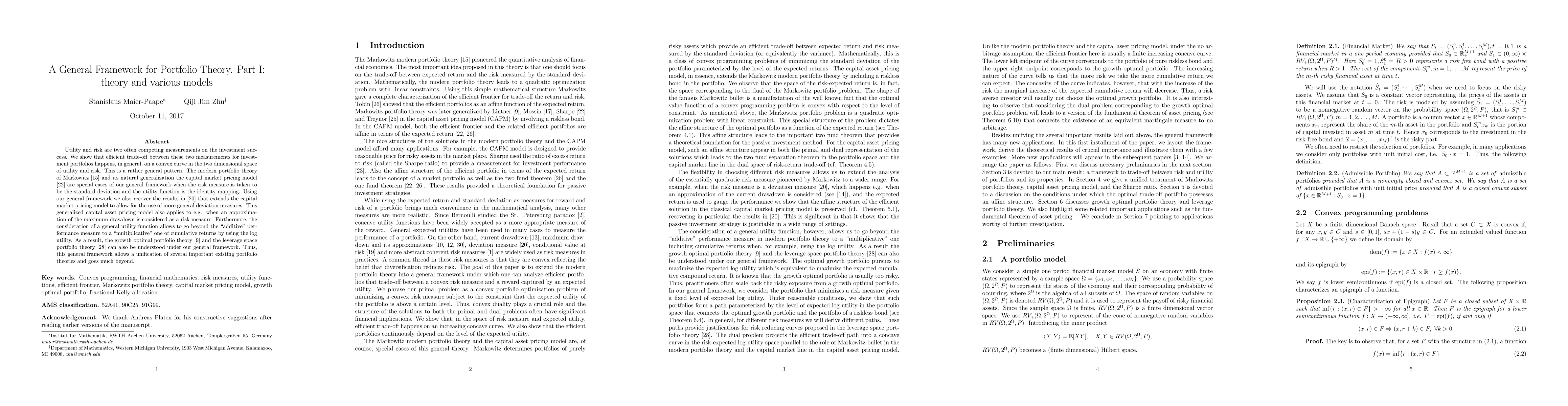 Utility and risk are two often competing measurements on the investment success. We show that efficient trade-off between these two measurements for investment portfolios happens, in general, on a convex curve in the two dimensional space of utility and risk. This is a rather general pattern. The modern portfolio theory of Markowitz [H. Markowitz, Portfolio Selection, 1959] and its natural generalization, the capital market pricing model, [W. F. Sharpe, Mutual fund performance , 1966] are special cases of our general framework when the risk measure is taken to be the standard deviation and the utility function is the identity mapping. Using our general framework, we also recover the results in [R. T. Rockafellar, S. Uryasev and M. Zabarankin, Master funds in portfolio analysis with general deviation measures, 2006] that extends the capital market pricing model to allow for the use of more general deviation measures. This generalized capital asset pricing model also applies to e.g. when an approximation of the maximum drawdown is considered as a risk measure. Furthermore, the consideration of a general utility function allows to go beyond the "additive" performance measure to a "multiplicative" one of cumulative returns by using the log utility. As a result, the growth optimal portfolio theory [J. Lintner, The valuation of risk assets and the selection of risky investments in stock portfolios and capital budgets, 1965] and the leverage space portfolio theory [R. Vince, The Leverage Space Trading Model, 2009] can also be understood under our general framework. Thus, this general framework allows a unification of several important existing portfolio theories and goes much beyond.