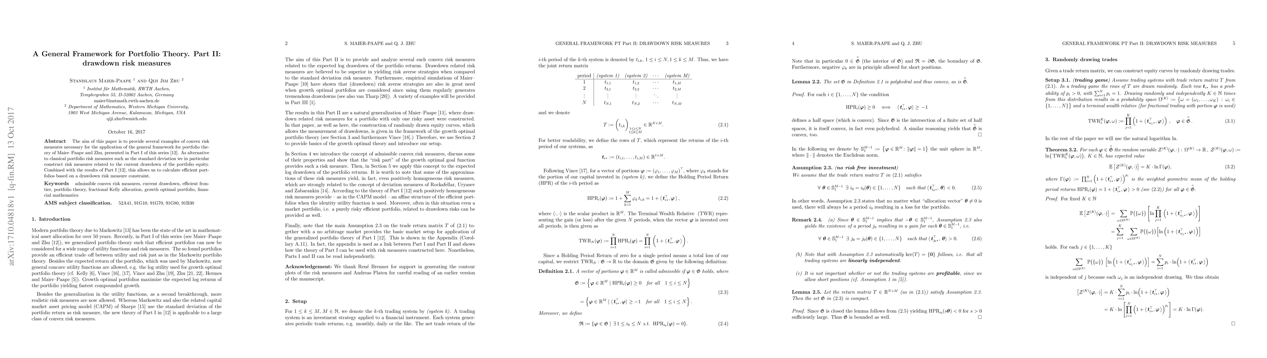 This paper introduces convex risk measures, particularly those related to portfolio drawdown, to enhance the general portfolio theory framework by Maier-Paape and Zhu. It provides alternatives to traditional risk measures like standard deviation and enables the calculation of efficient portfolios based on drawdown constraints.